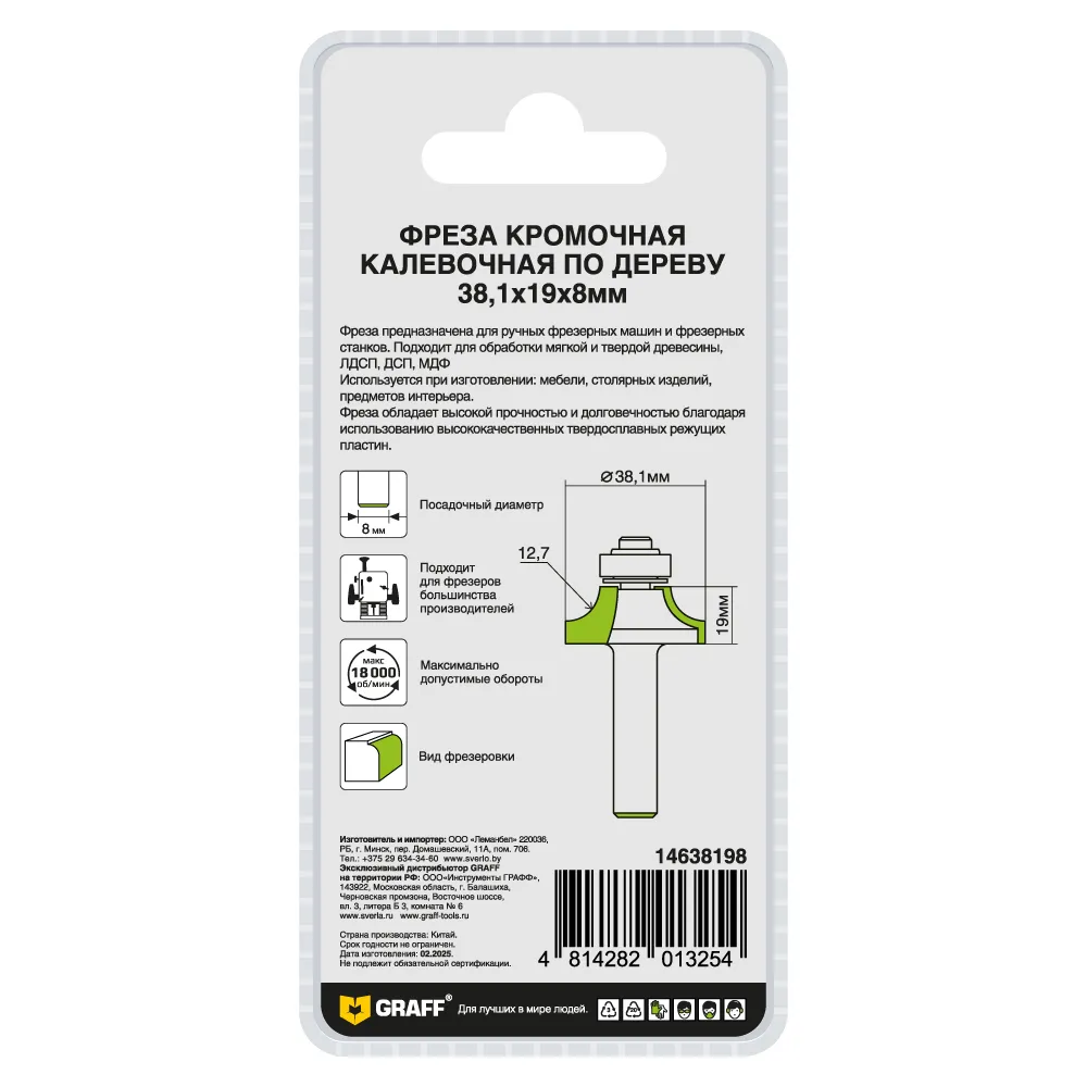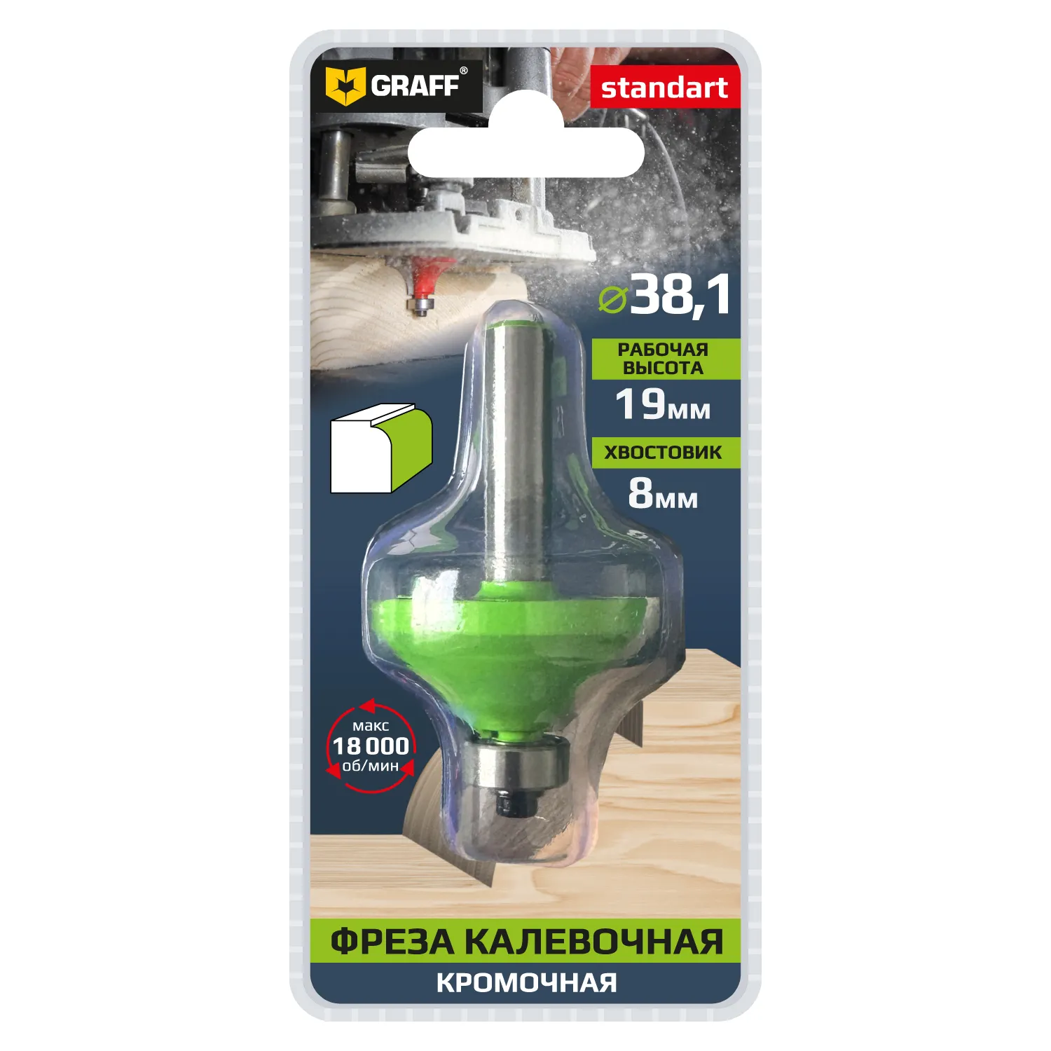 Фреза кромочная калевочная по дереву 38,1х19x8 мм GRAFF с цилиндрическим хвостовиком применяется для обработки мягкой и твердой древесины, ЛДСП, ДСП, МДФ.