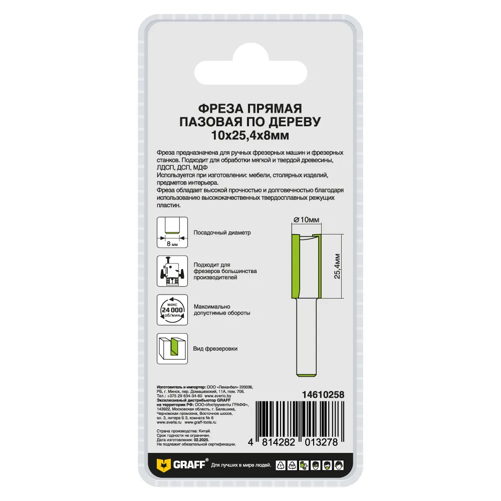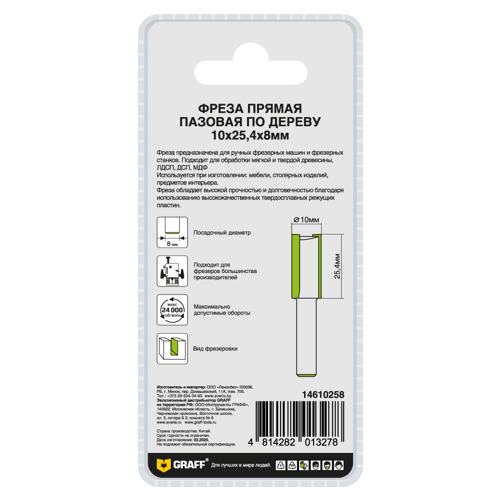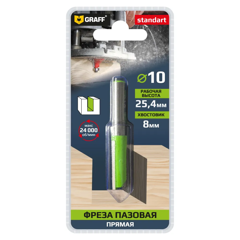 Фреза пазовая по дереву 10х25,4x8 мм GRAFF с цилиндрическим хвостовиком применяется для обработки мягкой и твердой древесины, ЛДСП, ДСП, МДФ.