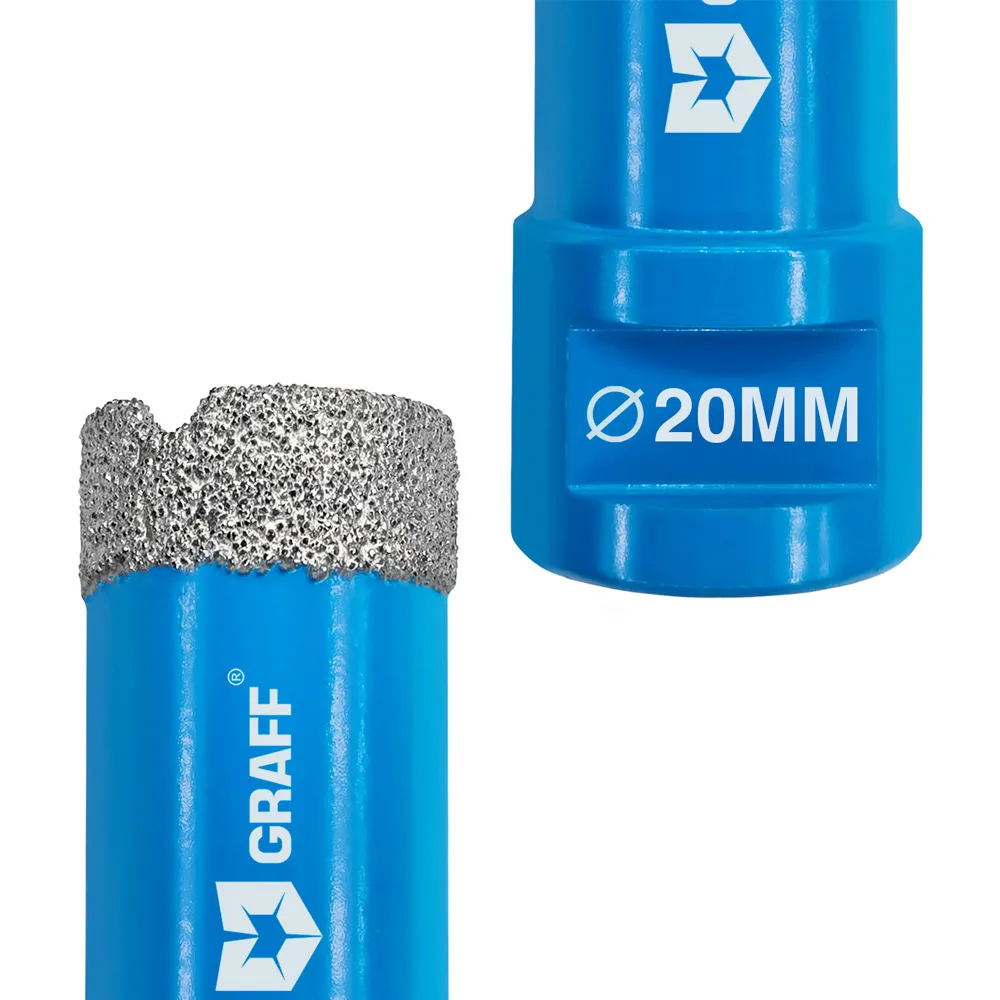 Высококачественная алмазная коронка GRAFF предназначена для быстрого и точного сверления отверстий в таких материалах, как мрамор, керамика, гранит, стекло, кварцевый камень, все виды керамической плитки и т. д.