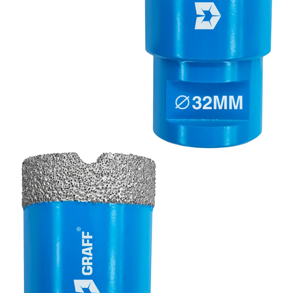 Высококачественная алмазная коронка GRAFF предназначена для быстрого и точного сверления отверстий в таких материалах, как мрамор, керамика, гранит, стекло, кварцевый камень, все виды керамической плитки и т. д.