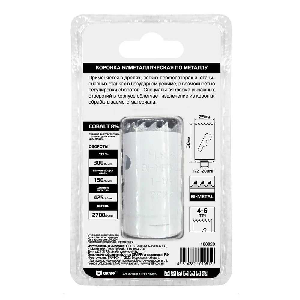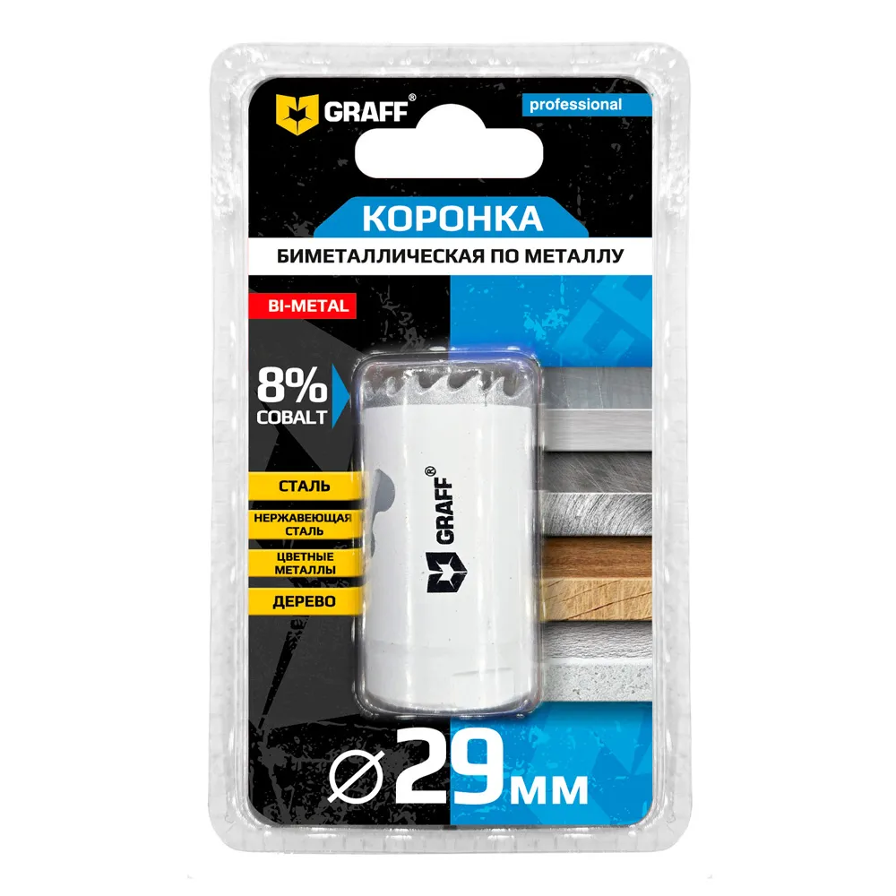 Биметаллическая коронка GRAFF 29 mm изготовлена из быстрорежущей стали с содержанием кобальта 8% в режущей кромке, что гарантирует исключительную износостойкость и обеспечивает надежную и эффективную работу с максимально широким спектром материалов: нержавеющая сталь, листовой металл, твердые и мягкие породы древесины, сэндвич-панели, алюминий, цветные металлы, пластик, оргстекло и гипсокартон.