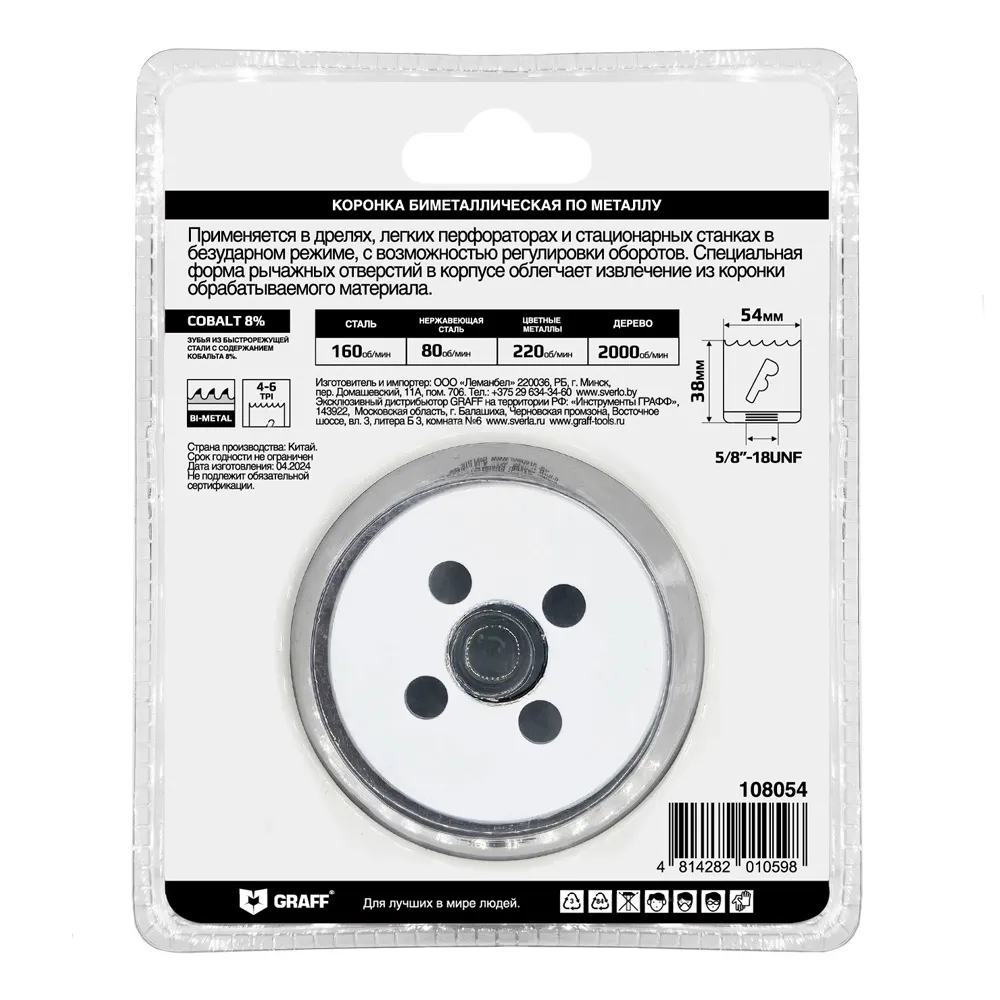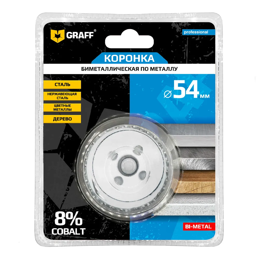 Биметаллическая коронка GRAFF 54 mm изготовлена из быстрорежущей стали с содержанием кобальта 8% в режущей кромке, что гарантирует исключительную износостойкость и обеспечивает надежную и эффективную работу с максимально широким спектром материалов: нержавеющая сталь, листовой металл, твердые и мягкие породы древесины, сэндвич-панели, алюминий, цветные металлы, пластик, оргстекло и гипсокартон.