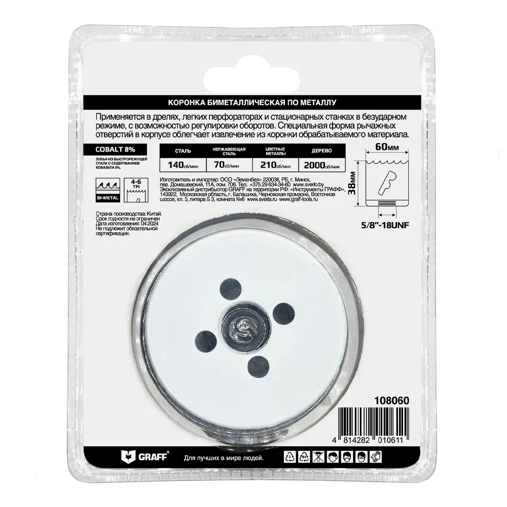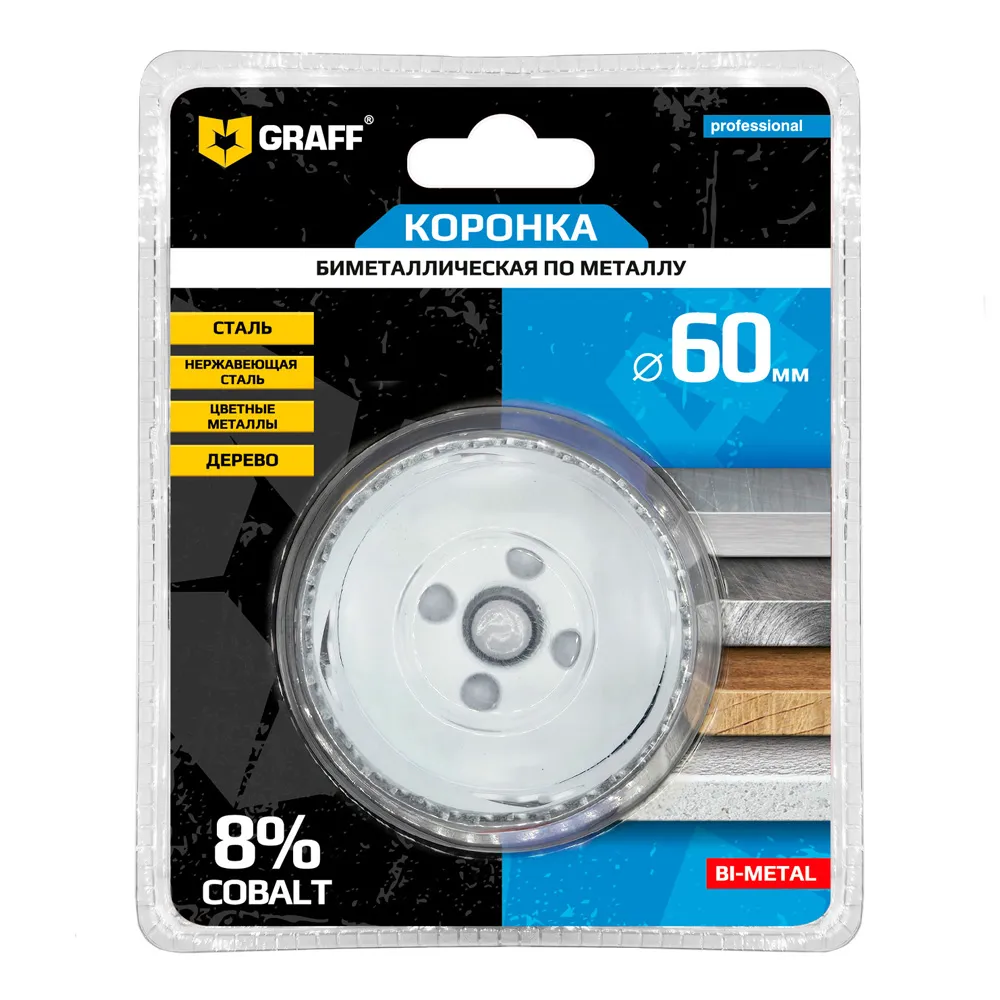 Биметаллическая коронка GRAFF 60 mm изготовлена из быстрорежущей стали с содержанием кобальта 8% в режущей кромке, что гарантирует исключительную износостойкость и обеспечивает надежную и эффективную работу с максимально широким спектром материалов: нержавеющая сталь, листовой металл, твердые и мягкие породы древесины, сэндвич-панели, алюминий, цветные металлы, пластик, оргстекло и гипсокартон.