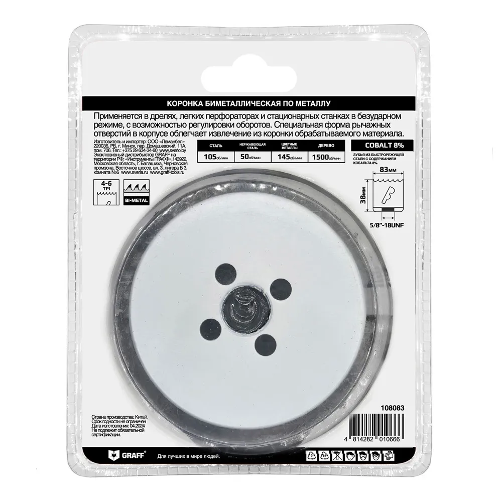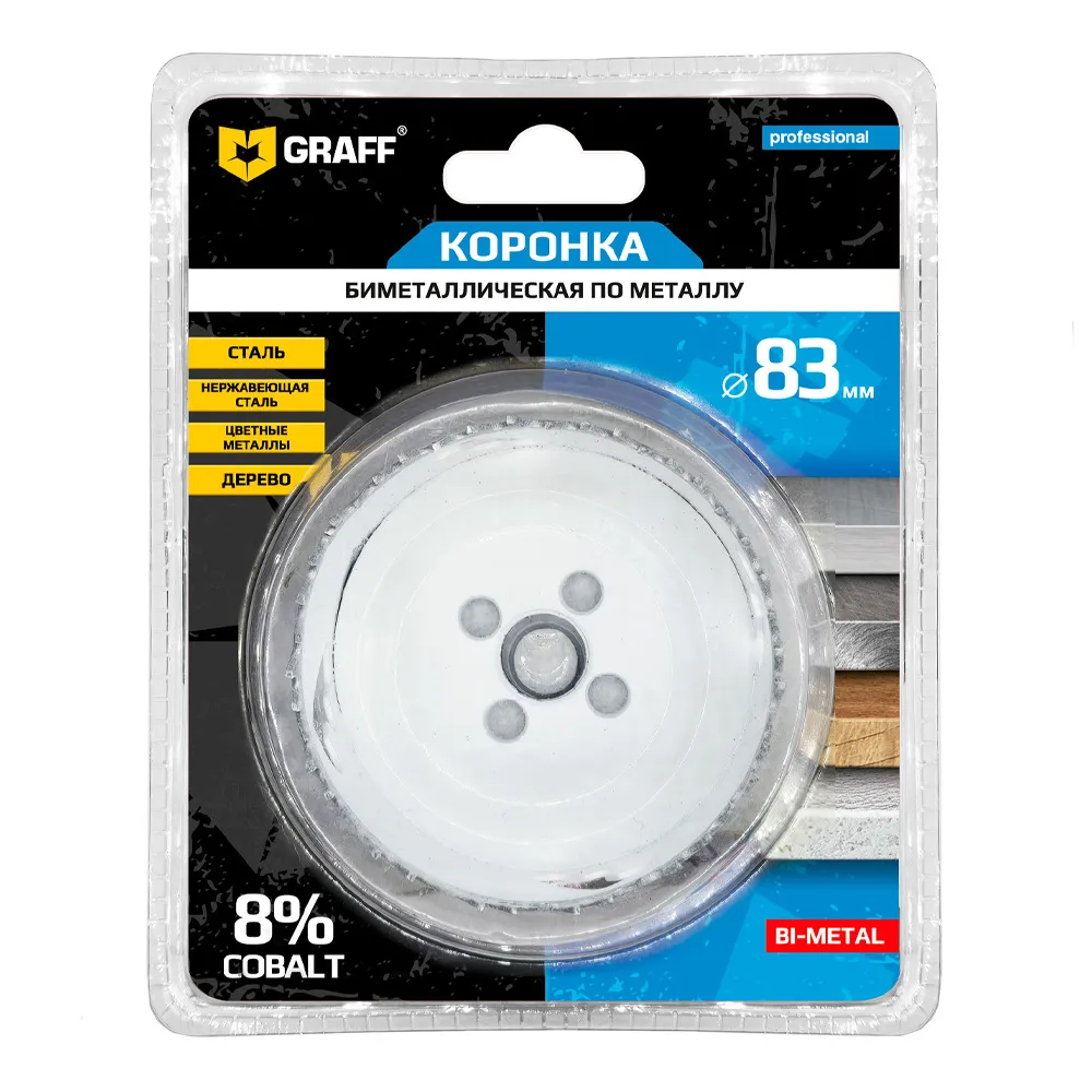 Биметаллическая коронка GRAFF 83 mm изготовлена из быстрорежущей стали с содержанием кобальта 8% в режущей кромке, что гарантирует исключительную износостойкость и обеспечивает надежную и эффективную работу с максимально широким спектром материалов: нержавеющая сталь, листовой металл, твердые и мягкие породы древесины, сэндвич-панели, алюминий, цветные металлы, пластик, оргстекло и гипсокартон.