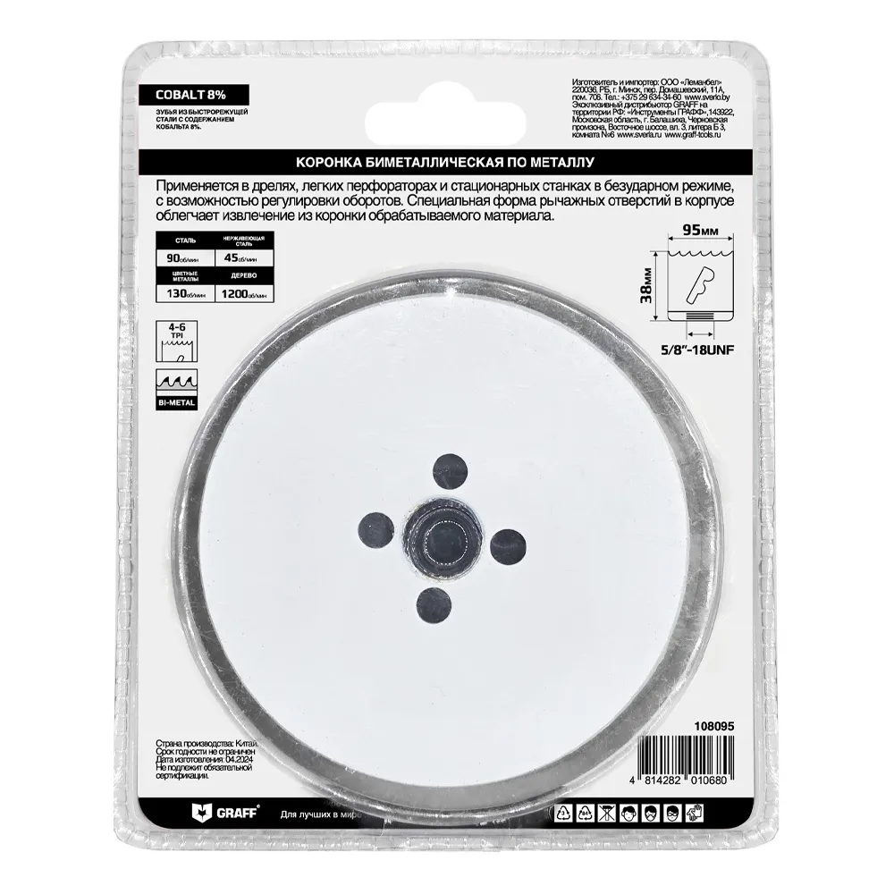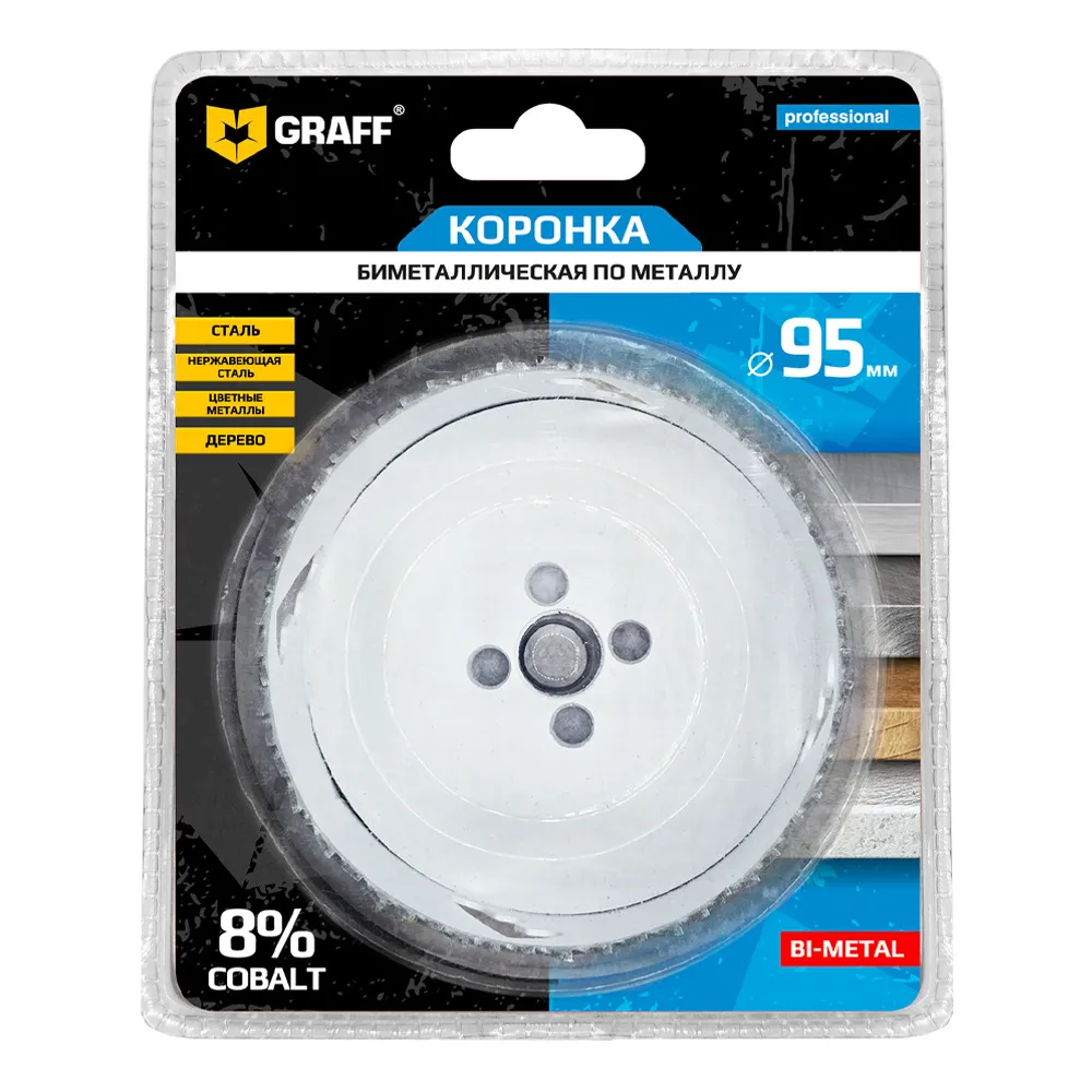 Биметаллическая коронка GRAFF 95 mm изготовлена из быстрорежущей стали с содержанием кобальта 8% в режущей кромке, что гарантирует исключительную износостойкость и обеспечивает надежную и эффективную работу с максимально широким спектром материалов: нержавеющая сталь, листовой металл, твердые и мягкие породы древесины, сэндвич-панели, алюминий, цветные металлы, пластик, оргстекло и гипсокартон.