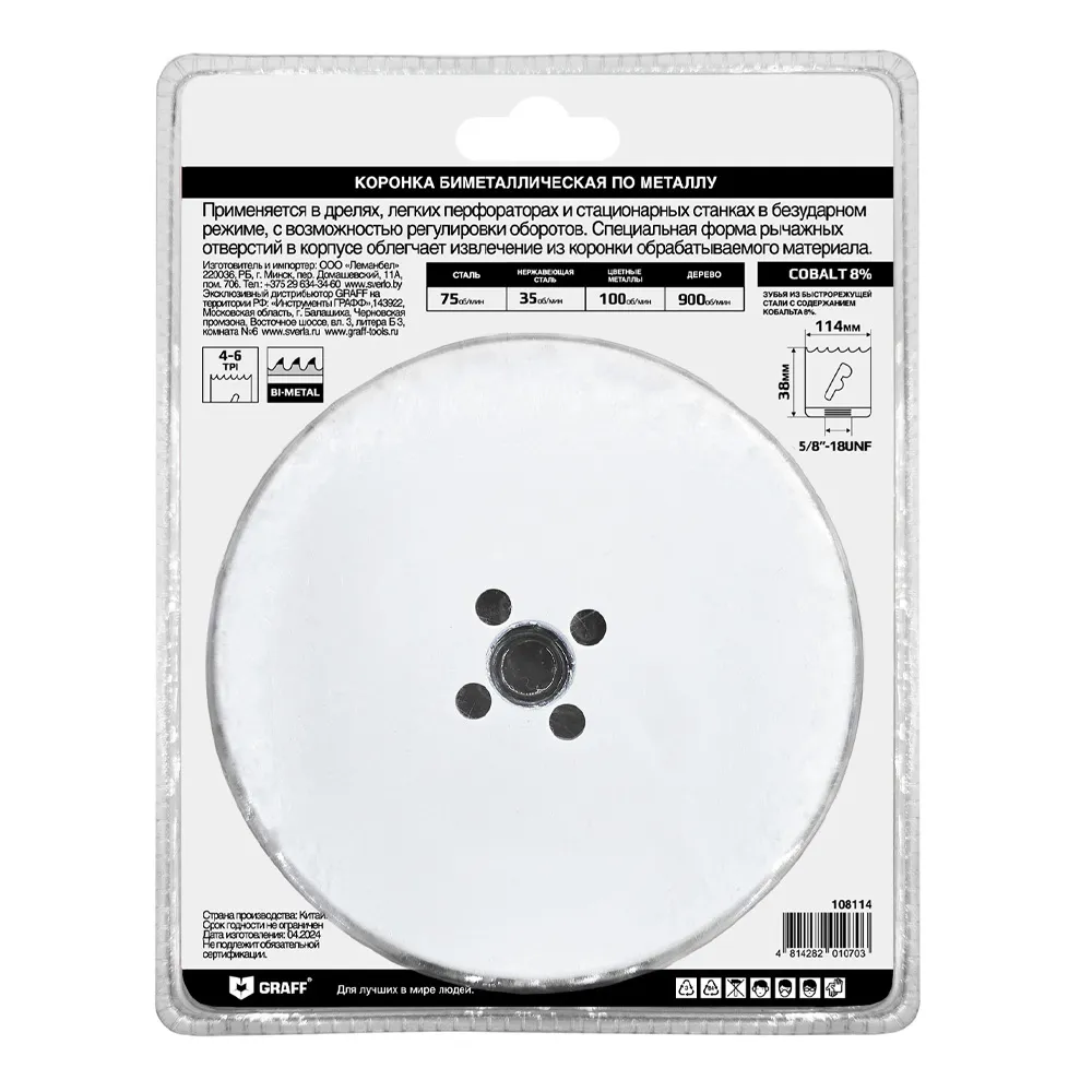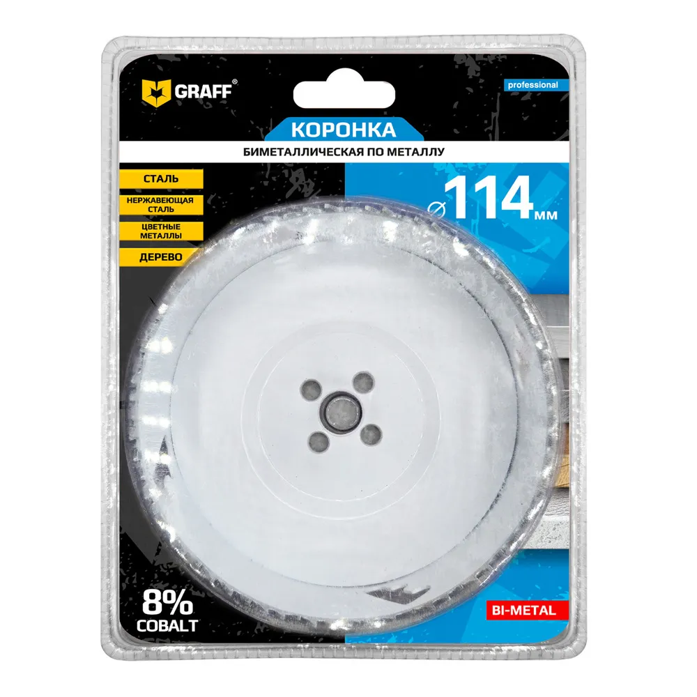 Биметаллическая коронка GRAFF 114 mm изготовлена из быстрорежущей стали с содержанием кобальта 8% в режущей кромке, что гарантирует исключительную износостойкость и обеспечивает надежную и эффективную работу с максимально широким спектром материалов: нержавеющая сталь, листовой металл, твердые и мягкие породы древесины, сэндвич-панели, алюминий, цветные металлы, пластик, оргстекло и гипсокартон.