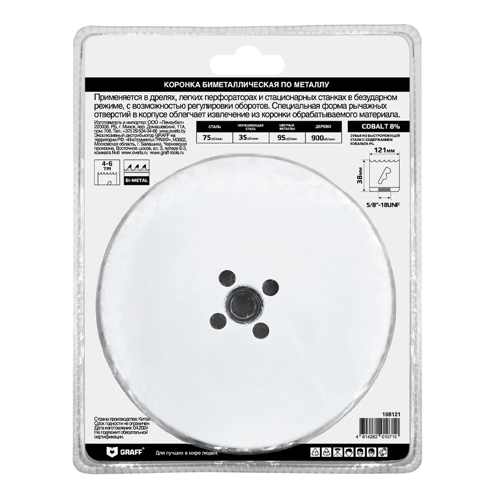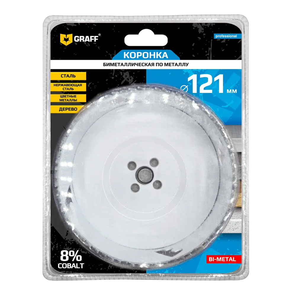 Биметаллическая коронка GRAFF 121 mm изготовлена из быстрорежущей стали с содержанием кобальта 8% в режущей кромке, что гарантирует исключительную износостойкость и обеспечивает надежную и эффективную работу с максимально широким спектром материалов: нержавеющая сталь, листовой металл, твердые и мягкие породы древесины, сэндвич-панели, алюминий, цветные металлы, пластик, оргстекло и гипсокартон.