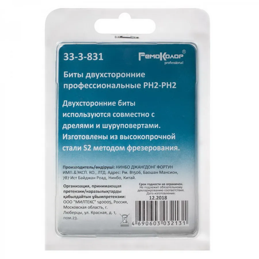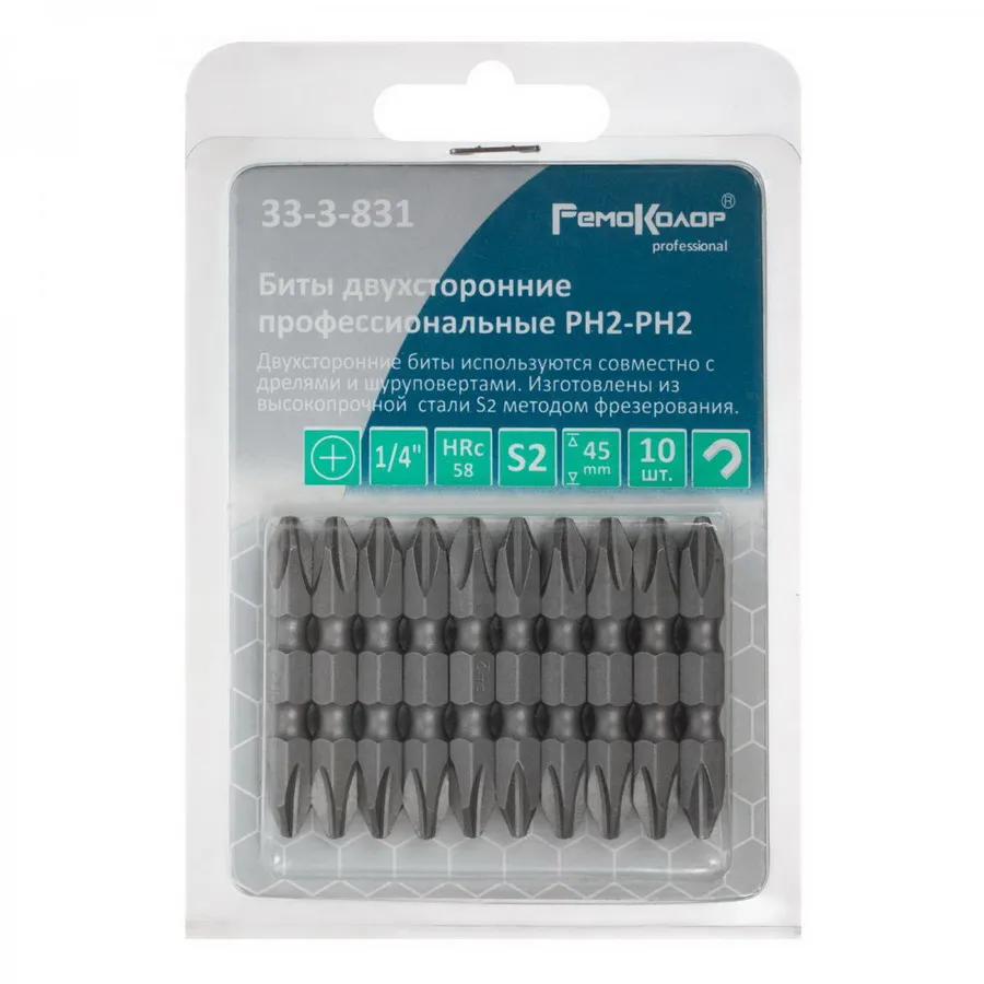 Биты РемоКолор двухсторонние, Ph2-Ph 2х45 мм 33-3-831 используются совместно с дрелями и шуруповертами. Изготовлены из высокопрочной стали S2 методом фрезерования.