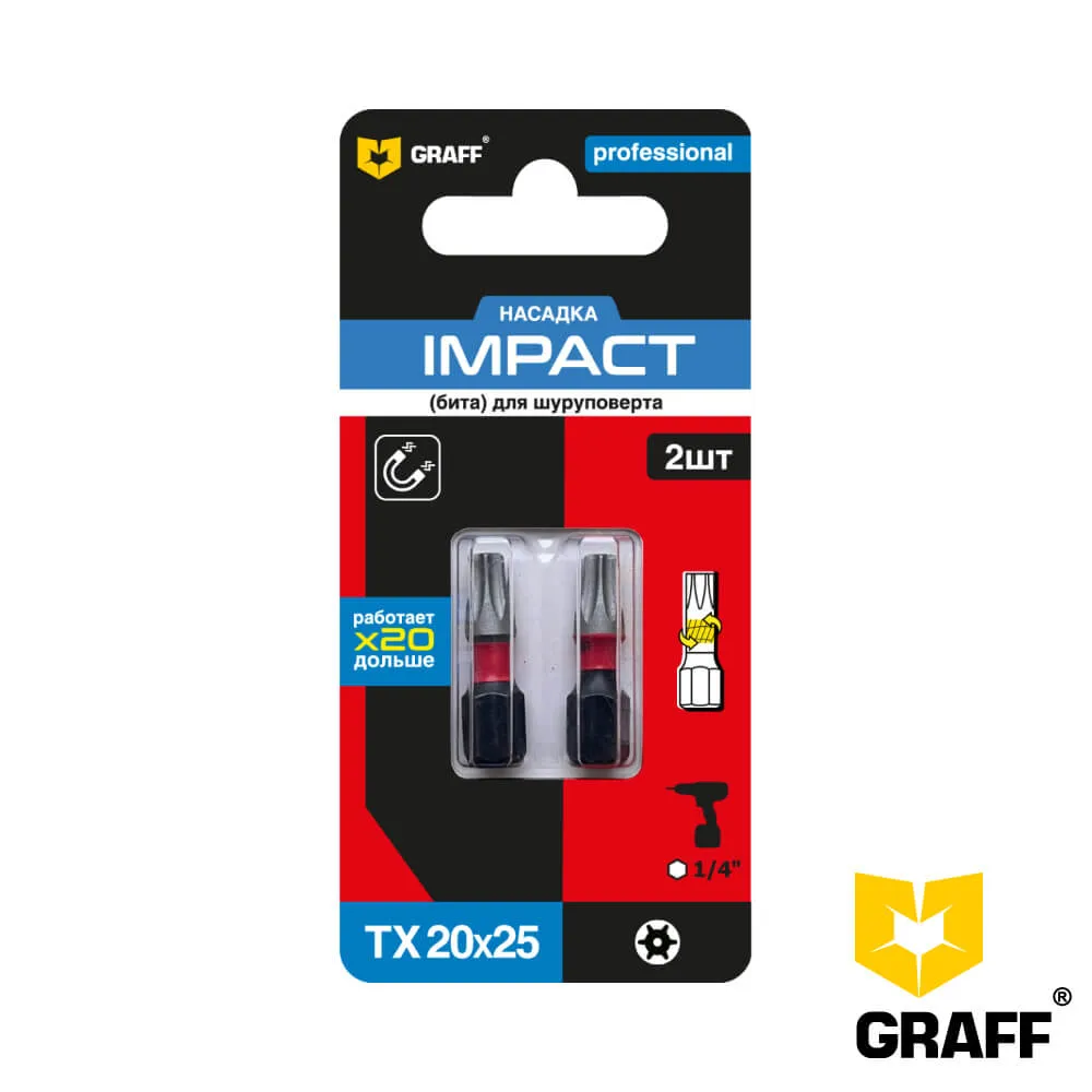Биты GRAFF серии IMPACT TX 20x25 мм специально разработаны для тяжелых условий, особенно при работе с импульсными шуруповертами и гайковертами.