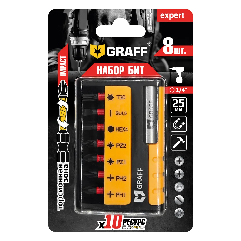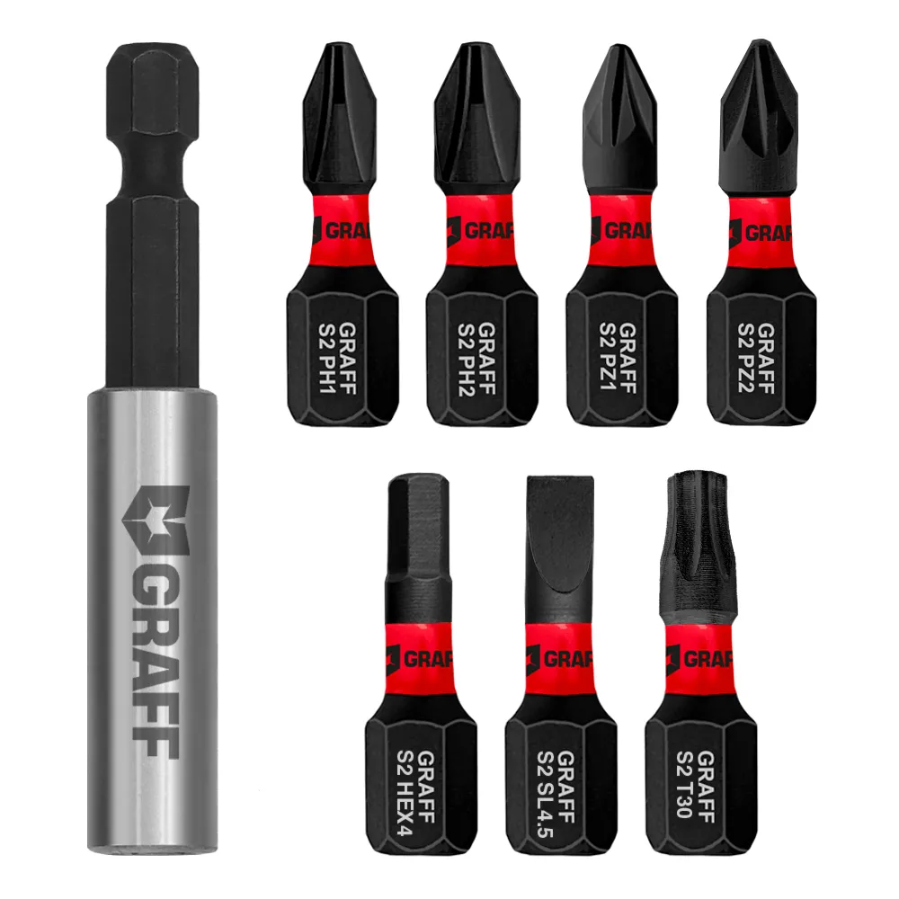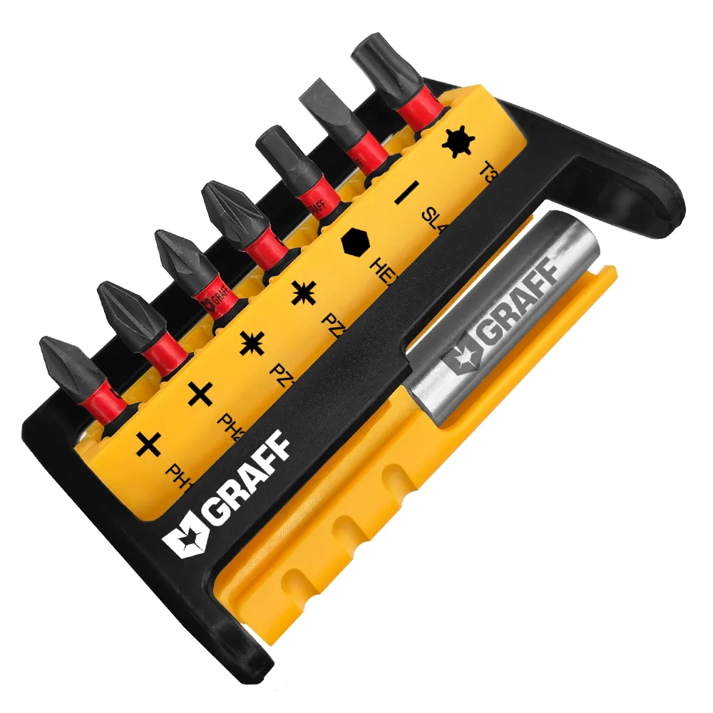 Набор из 7 бит HEX Impact + магнитный держатель GRAFF серия "Expert" специально разработан для тяжелых условий, особенно при работе с импульсными шуруповертами и гайковертами.
