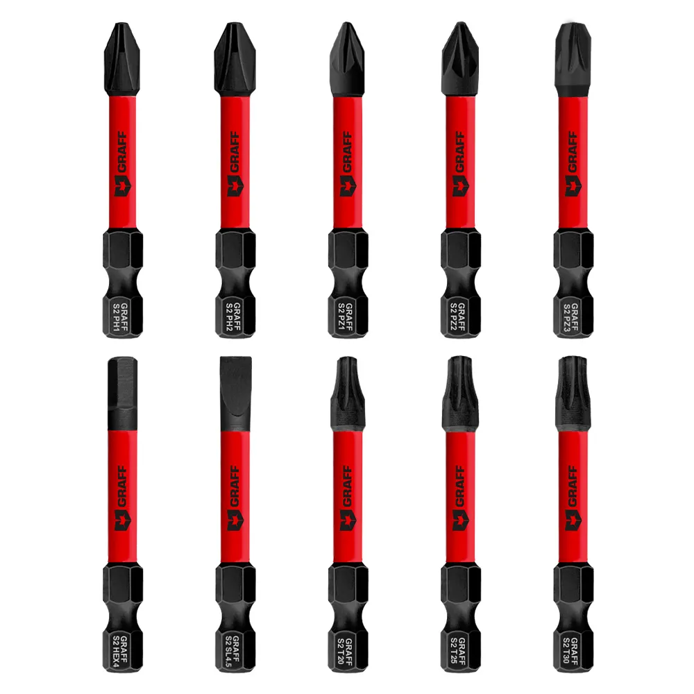 Набор из 10 бит HEX Impact GRAFF серия "Expert" специально разработан для тяжелых условий, особенно при работе с импульсными шуруповертами и гайковертами.