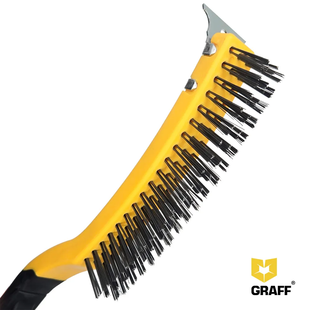 Щетка по металлу трехрядная ручная со скребком GRAFF изготовлена из стальной металлической проволоки, выдерживает высокие нагрузки и особо устойчива к стиранию, поможет произвести зачистку поверхностей от различных видов загрязнений.
