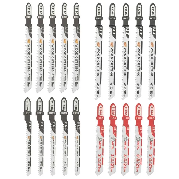 В набор входят два типа пилок по дереву по 5 штук, пилки для криволинейных резов в дереве 5 шт. и пилки по металлу 5 шт.