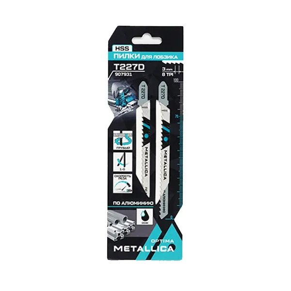 *Серия OPTIMA. Мод. T227D. Длина общая 100 мм, рабочая 75 мм, шаг 3 мм, ширина пропила 1,5 мм. Эффективная толщина пиления: листовой алюминий 3-10 мм, алюминиевый профиль до 50 мм, пластиковая труба до 50 мм, древесина 10-50 мм. Упаковка: картонный подвес - 2 шт.