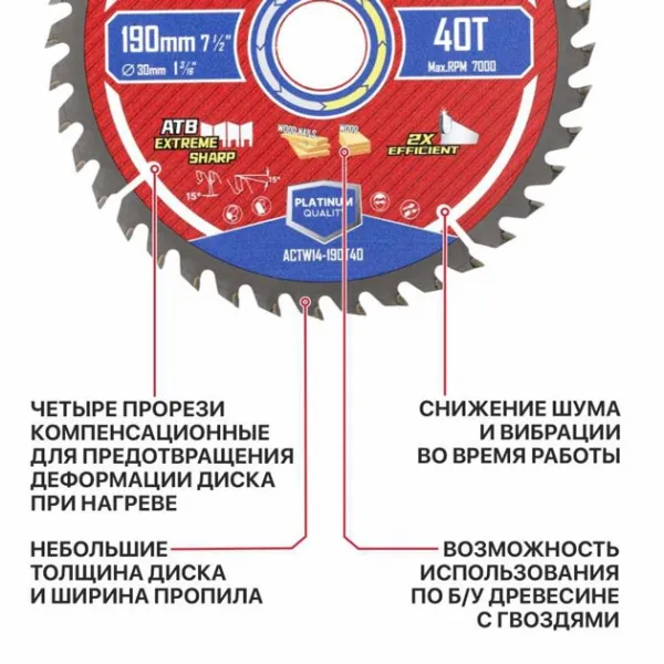 Диск пильный с твердосплавными напайками по дереву для циркулярных и торцовочных пил ACTW14-190T40 отличный вариант для распила древесины, досок, многослойных плит, древесностружечных плит (ДСП, OSB, фанеры и т.д.).