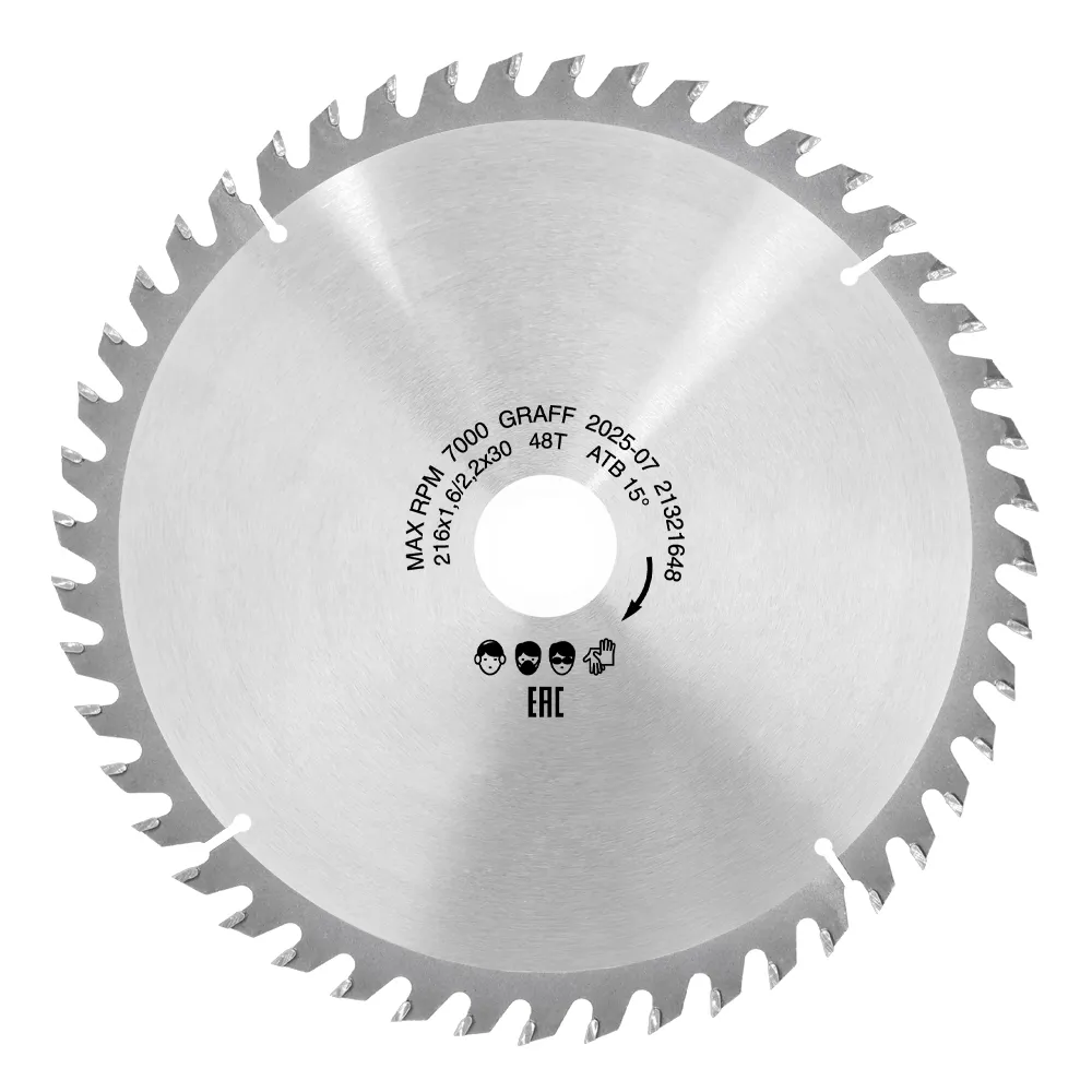 Пильный диск по дереву 216x1.6/2.2x30/25.4/20 х 48Т чистовая обработка GRAFF предназначен для поперечного или продольного распила древесины, ДСП, фанеры и МДФ.