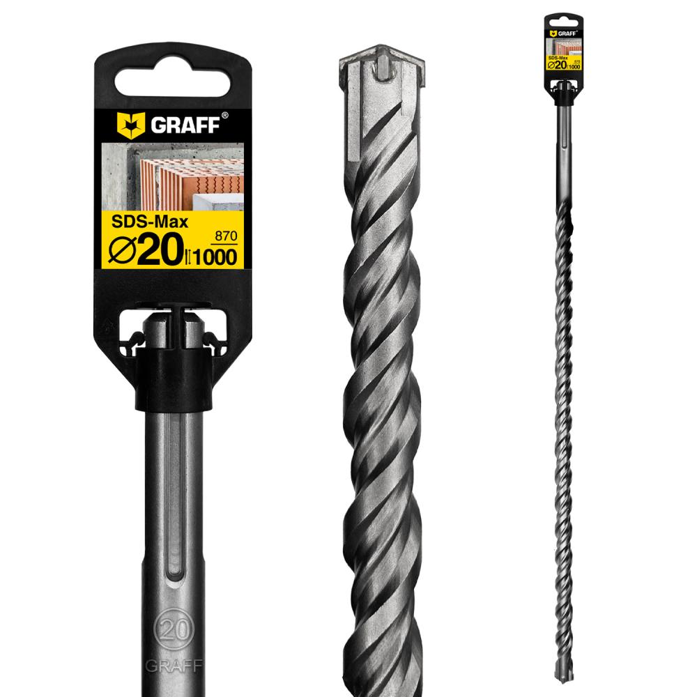 Сверло (бур) по бетону 20x870x1000 мм для перфоратора SDS max GRAFF предназначен для сверления бетона, кирпича, камня, газосиликата и других твердых материалов