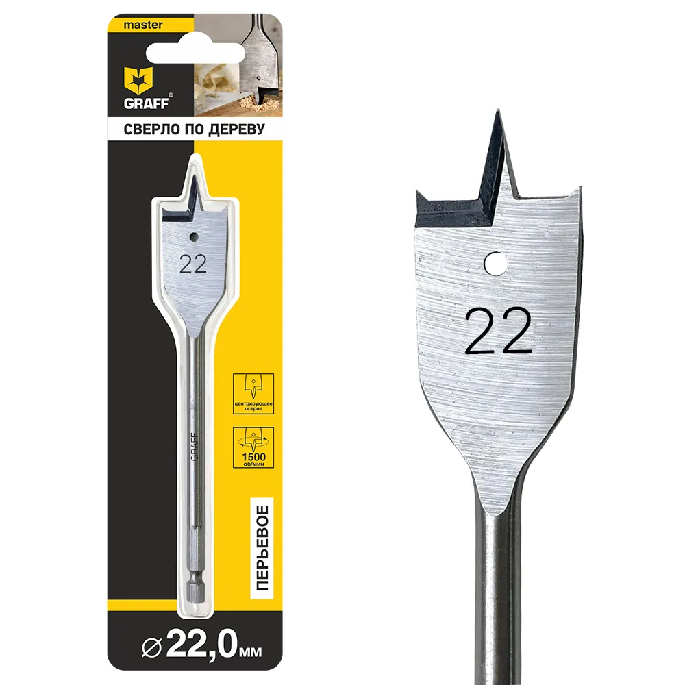 Сверло перьевое (перовое) по дереву 22,0x150 мм GRAFF изготовлено из высококачественной износостойкой стали С45.