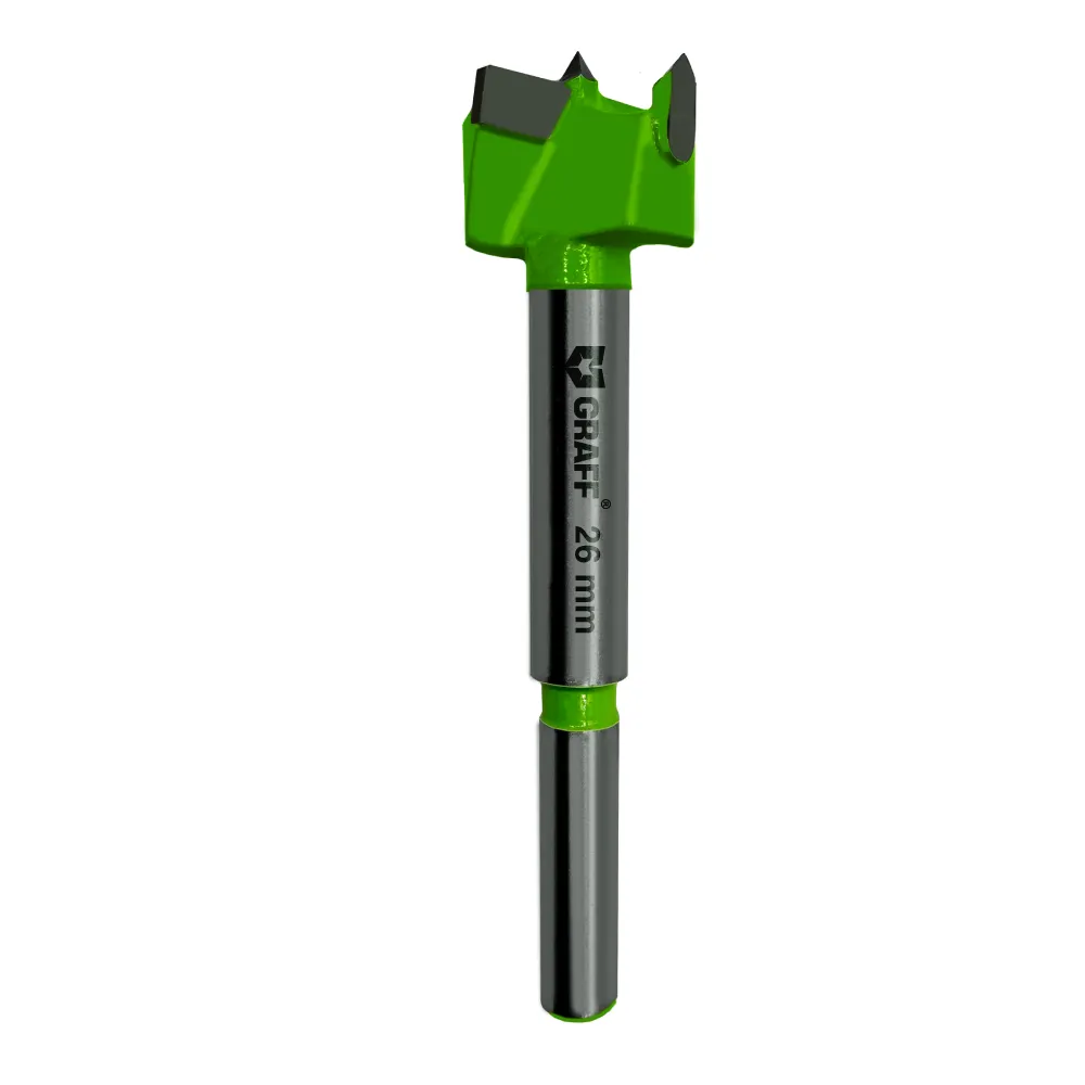 Усиленное сверло Форстнера изготовлено из углеродистой конструкционной нелегированной стали 45 с индустриальными режущими напайками из вольфрам-кобальтового твердого сплава YG8 c содержанием кобальта 8%, подходит для тяжелых работ в древесине любого вида.
