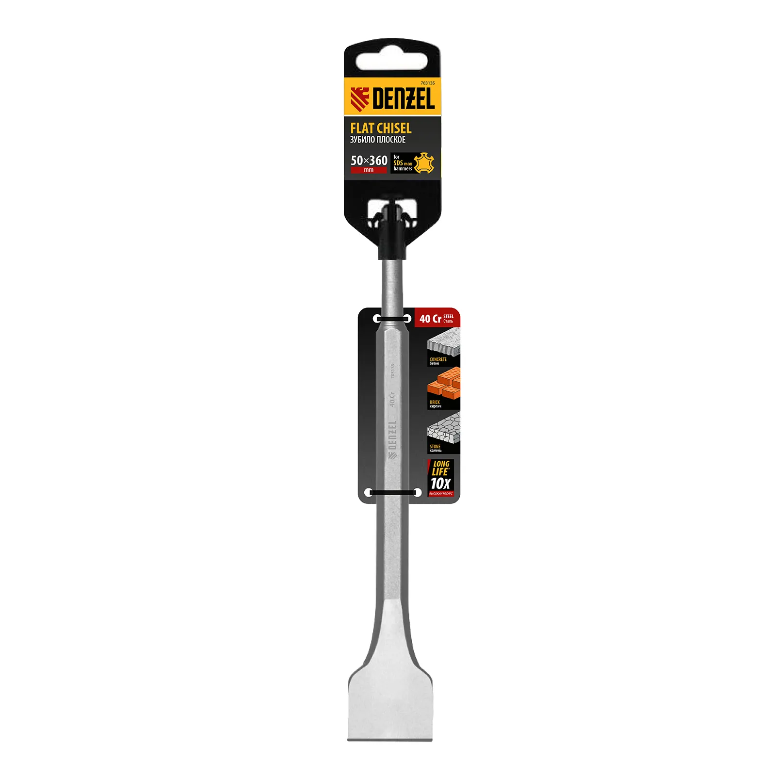 Плоское зубило Denzel 703135 размером 25 x 50 x 360 мм, из стали 40Cr, с хвостовиком SDS-max — оснастка для мощных, тяжелых перфораторов. Предназначено для эффективного выполнения ударных, демонтажных работ с твердыми материалами, такими как камень, бетон, кирпич. Пригодится на строительной площадке.
