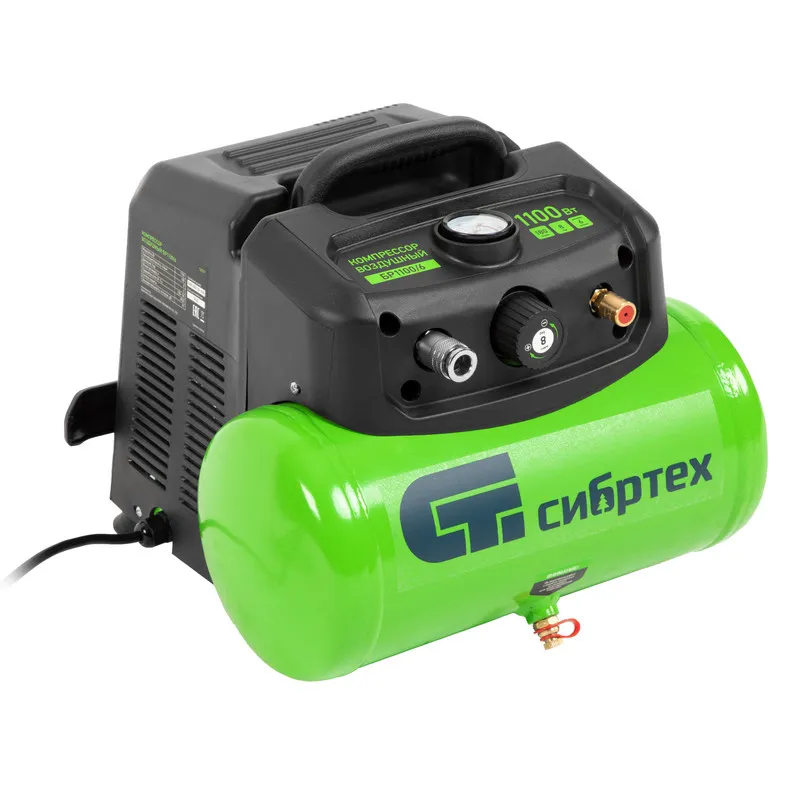 Воздушный безмасляный компрессор Сибртех BL 1100/6 58059 мощностью 1100 Вт, с ресивером емкостью 6 литров, служит для подачи сжатого воздуха под давлением до 8 бар со скоростью 180 л/мин. К нему можно подключить краскораспылитель, продувочный пистолет, заклепочник, пистолет для накачки шин и другой пневмоинструмент. Отсутствие масла делает компрессор оптимальным для выполнения покрасочных работ и продувки электронных компонентов. Устройство предназначено для бытового использования.