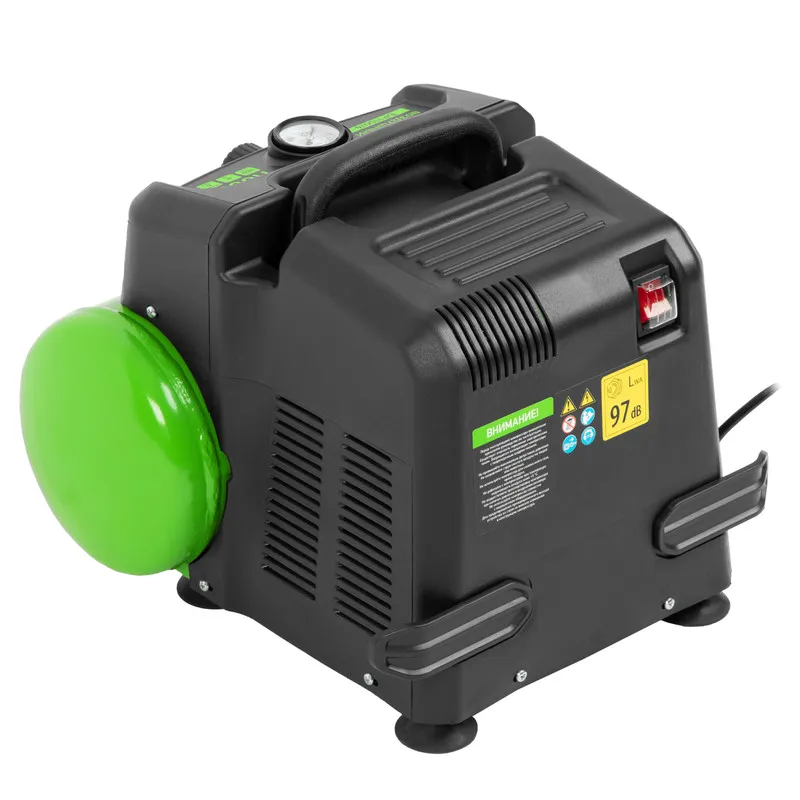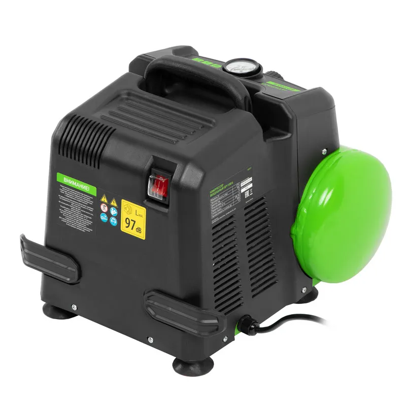 Одна из основных особенностей данной модели — компактность и удобство в перевозке. Компрессор отличается небольшим весом и дополнен эргономичной транспортировочной ручкой.