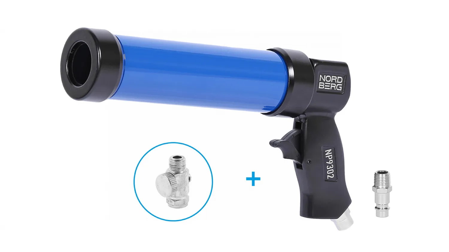 NORDBERG NP9302+R — пневматический пистолет для герметика. Используется при кузовном ремонте автомобилей, вклейке стёкол, панелей, а также в строительных и ремонтных работах.