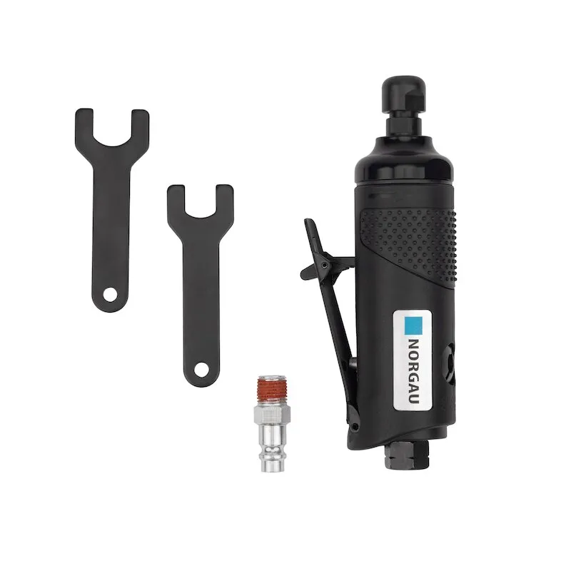 Прямая пневмошлифмашинка с цанговым патроном на 6 мм, тип NDG122-6. Интегрирован шпиндель с двойными подшипниками, рычаг блокировки для предотвращения случайного запуска. Нескользящая мягкая рукоятка обеспечивает надежное удержание. Регулятор скорости имеет плавный ход. Обороты холостого хода 20000 об/мин, потребление воздуха 114 л/мин. Размер шланга для подключения 10 мм, резьба штуцера подачи воздуха ¼. Масса 0,6 кг.