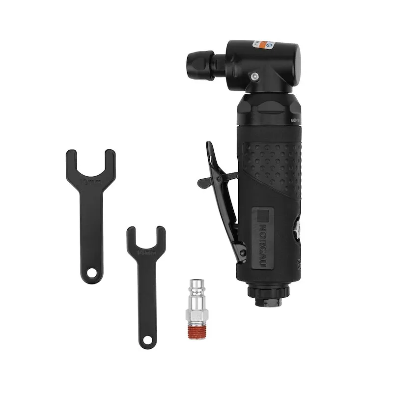 Угловая шлифмашина пневматическая с цанговым патроном 6 мм, тип NADG118-6090. Оснащена отводом воздуха в сторону от оператора. Рычаг блокировки встроен для предотвращения случайного запуска. Нескользящая мягкая рукоятка обеспечивает комфортное удержание. Плавный ход регулятора скорости повышает удобство эксплуатации. Обороты холостого хода 18000 об/мин, расход воздуха 85 л/мин. Минимальный диаметр шланга для подключения 10 мм, резьба штуцера подачи воздуха 1/4. Масса 0,8 кг.