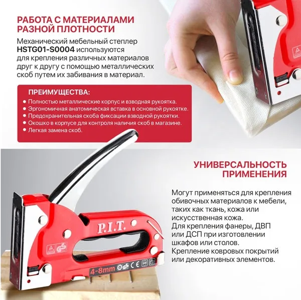Механический мебельный степлер HSTG01-S0004 используются для крепления различных материалов друг к другу с помощью металлических скоб путем их забивания в материал, создавая прочное соединение. Механические мебельные степлеры могут применяться для крепления обивочных материалов к мебели, таких как ткань, кожа или искусственная кожа. Для крепления фанеры, ДВП или ДСП при изготовлении шкафов или столов. Крепление ковровых покрытий или декоративных элементов.