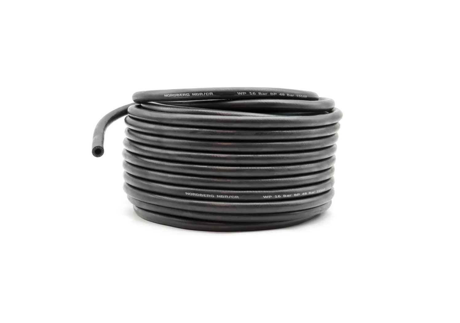 Шланг резиновый Nordberg H1423NBR с нитяным усилением предназначен для подачи под давлением сжатого воздуха, инертных газов, дизельного топлива, бензина, масел, щелочей и кислот (кроме азотной) с концентрацией до 20%.