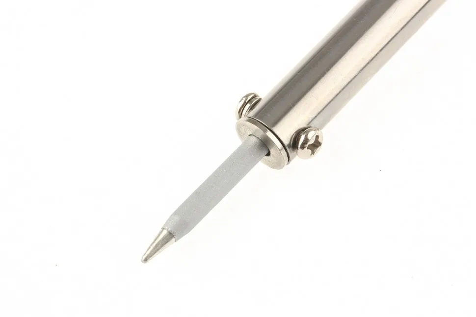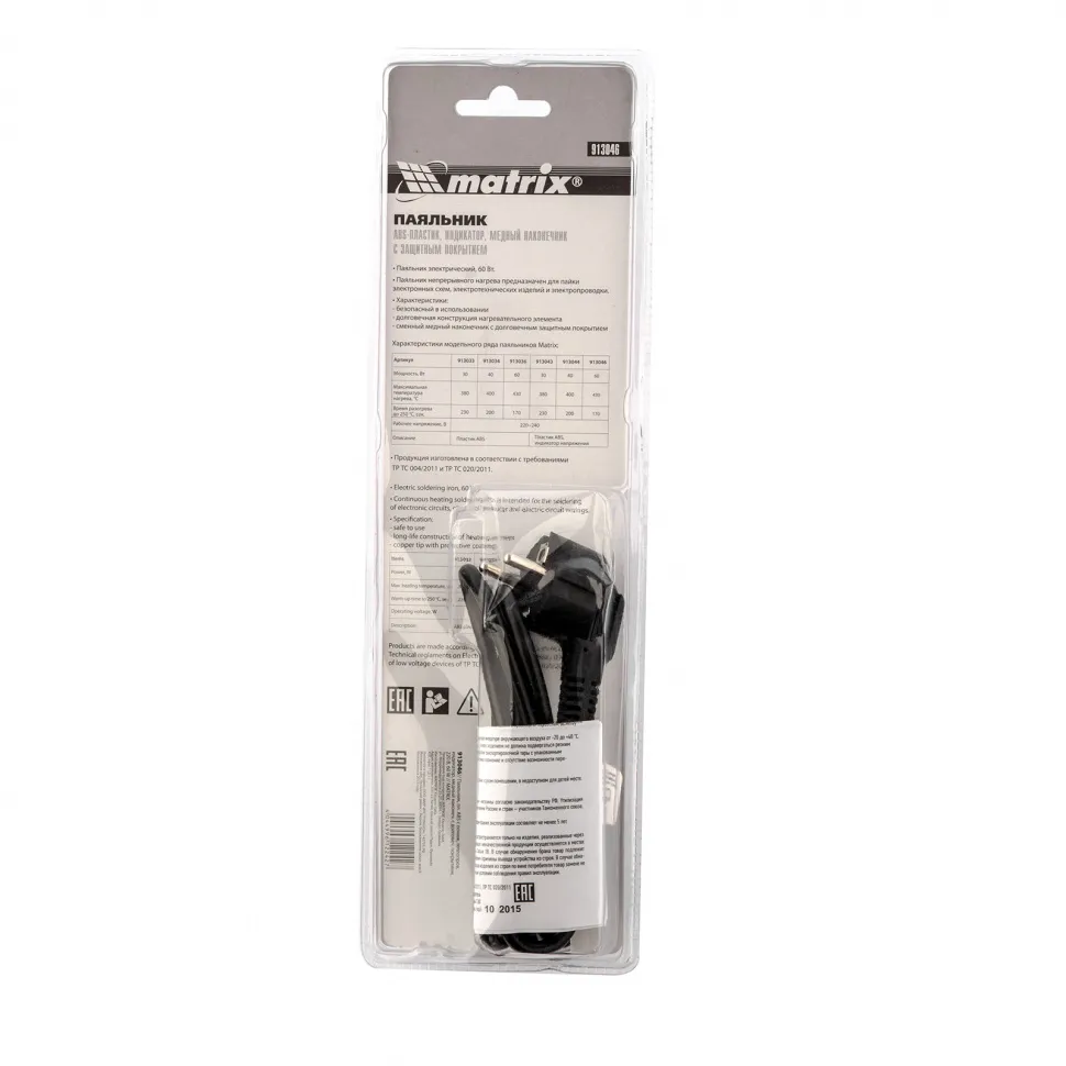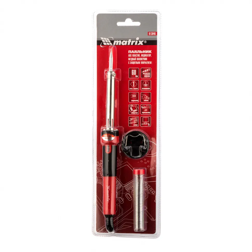 Паяльник Matrix 913046, 220 В, 60 W, с корпусом из пластика ABS, индикатором и медным наконечником с долговечным гальваническим покрытием, имеет класс защиты 1 и используется для пайки микрочипов, транзисторов, проводки и электросхем. Поставляется с припоем в пластиковой тубе, поэтому полностью готов к работе. Благодаря нихромовой спирали и корпусу из ударопрочного ABS-пластика паяльник устойчив к повреждениям и рассчитан на длительный срок службы. Конусовидное жало удобно для прецизионной пайки. Прибор пригодится радиолюбителям, автоэлектрикам, а также будет полезен в быту.ПреимуществаЖало быстро нагревается, т.к. изготовлено из меди.Рабочая поверхность защищена от коррозии хромированным покрытием, которое к тому же улучшает прилипание припоя.Нагретый паяльник можно разместить на подставке, имеющейся в комплекте.Можно легко определить, что прибор включен в сеть, т.к. при наличии напряжения срабатывает световой индикатор.Наконечник при необходимости можно заменить, поскольку он съемный.Продолжительная работа с паяльником не вызывает усталость благодаря удобной пластиковой рукоятке с мягкой накладкой.Инструмент безопасен в использовании, т.к. ему присвоен класс защиты 1, а характеристики соответствуют требованиям технических регламентов Таможенного союза 004/2011 и 0020/2011.
