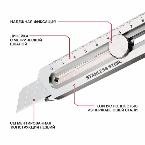 Лезвия имеют сегментированную конструкцию и можно легко отломить затупившийся сегмент. Прочный корпус из нержавеющей стали долговечен и устойчив к воздействию окружающей среды.