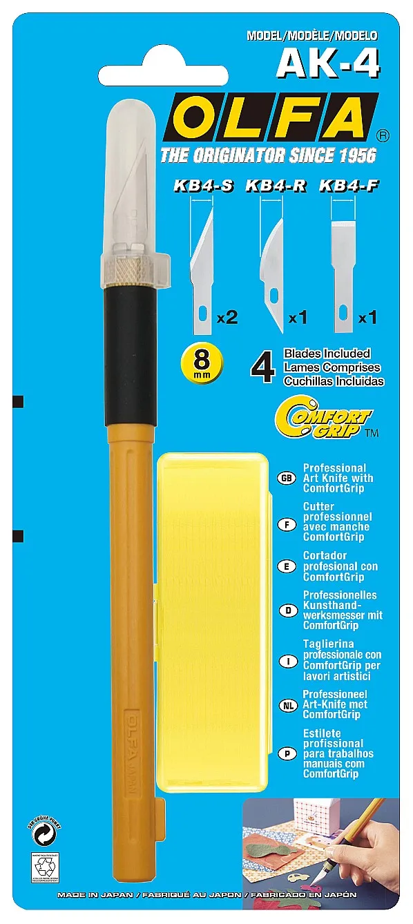 Профессиональный художественный нож OLFA AK-4 с рукояткой ComfortGrip и функцией быстрой смены лезвия обладает идеально продуманным дизайном и устройством стабилизации. Удобно лежит в руке, что обеспечивает наилучшее качество резки. Благодаря дополнительному весу в нижней части и механизму защиты от перекоса Вы можете безопасно и плавно завершить свой художественный проект. В комплект входят два прецизионных лезвия, одно зубило и одно изогнутое резное лезвие. Так что Вам больше не потребуется использовать несколько ножей, достаточно просто установить подходящее лезвие. Используется в мастерских и дизайн-студиях.