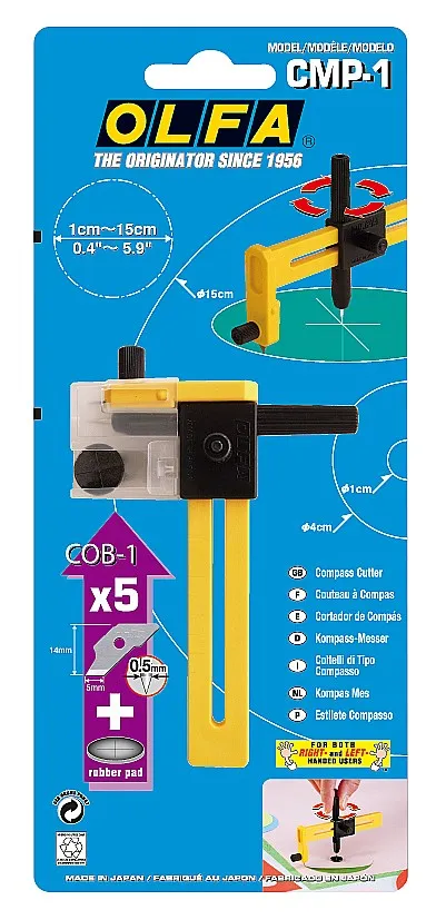 Циркульный резак OLFA CMP-1 идеально подходит для проектов связанных с вырезанием круглых поделок. Используйте резак, чтобы создавать круги из дерева или бумаги с высокой точностью. В ручке хранится 5 дополнительных лезвий. Предназначен для вырезания кругов диаметром от 10 до 150 мм.