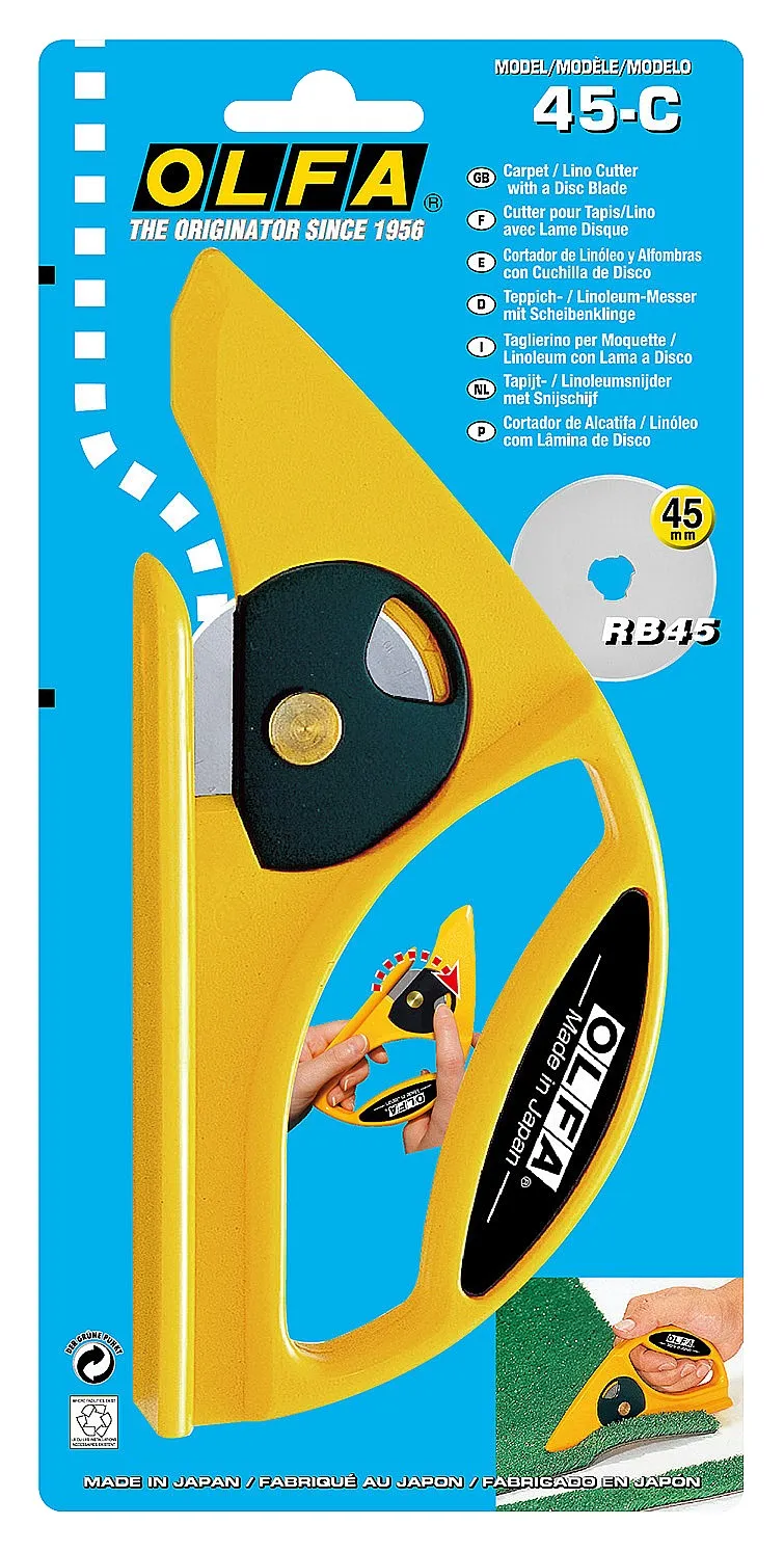 Если нужно разрезать рулонные материалы, такие как ковер, линолеум, ландшафтная ткань, бумага и т. д., то нож с круговым лезвием OLFA 45-C — это то, что Вам нужно.