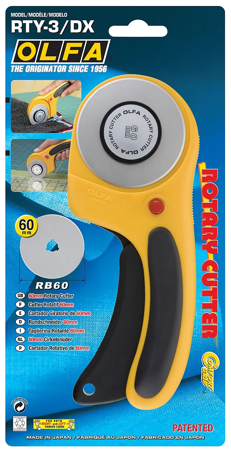 Эргономичный круговой нож OLFA RTY-3/DX может похвастаться высокой производительностью и безопасностью. Идеально подходит и для тонких, и для плотных тканей, включая флис, шерсть, кожу и т. д.
