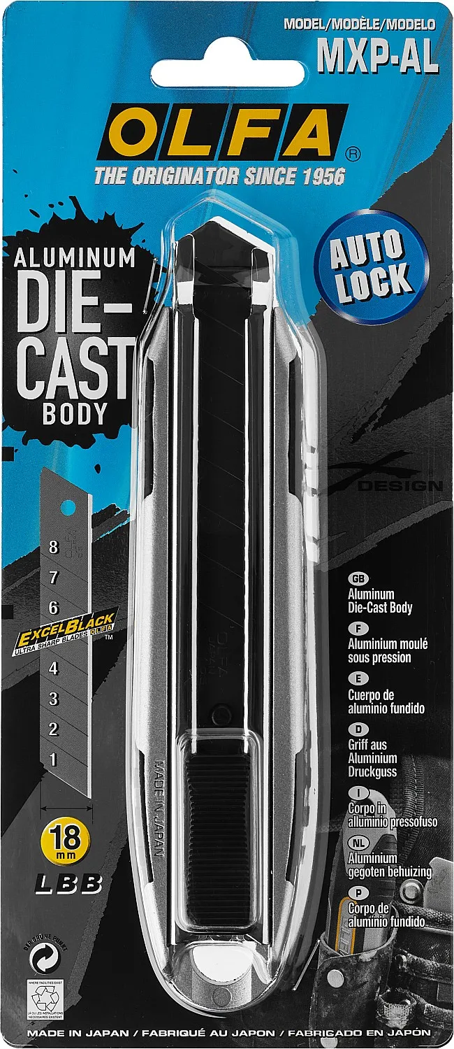 Нож из литого алюминия OLFA MXP-AL для точного и уверенного реза. Корпус из нержавеющей стали надежно фиксирует лезвие, обеспечивая исключительную долговечность даже при непрерывном использовании. Ультра-острое черное сегментированное лезвие LBB шириной 18 мм на 25% острее стандартных лезвий OLFA, что делает этот универсальный нож выбором профессионалов.