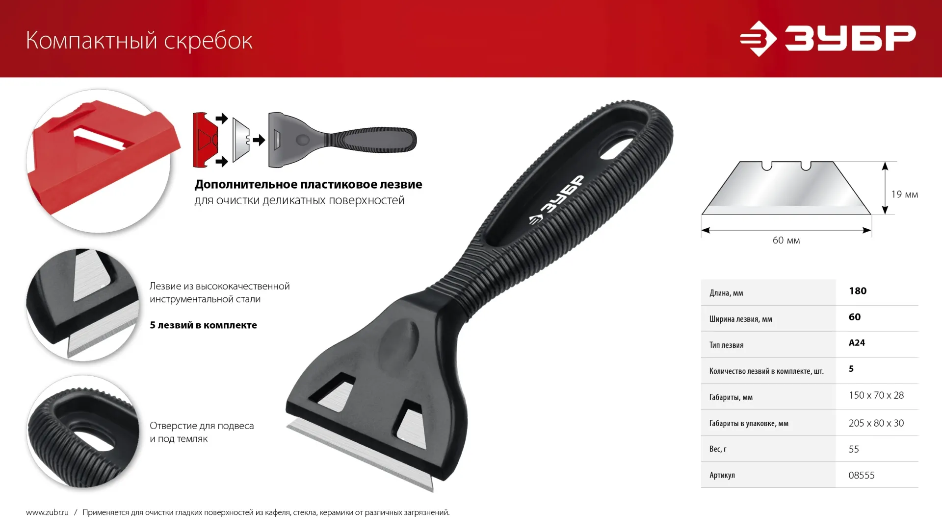 Скребок предназначен для зачистки поверхностей от различных загрязнений. Сменное пластиковое лезвие в комплекте для зачистки деликатных поверхностей