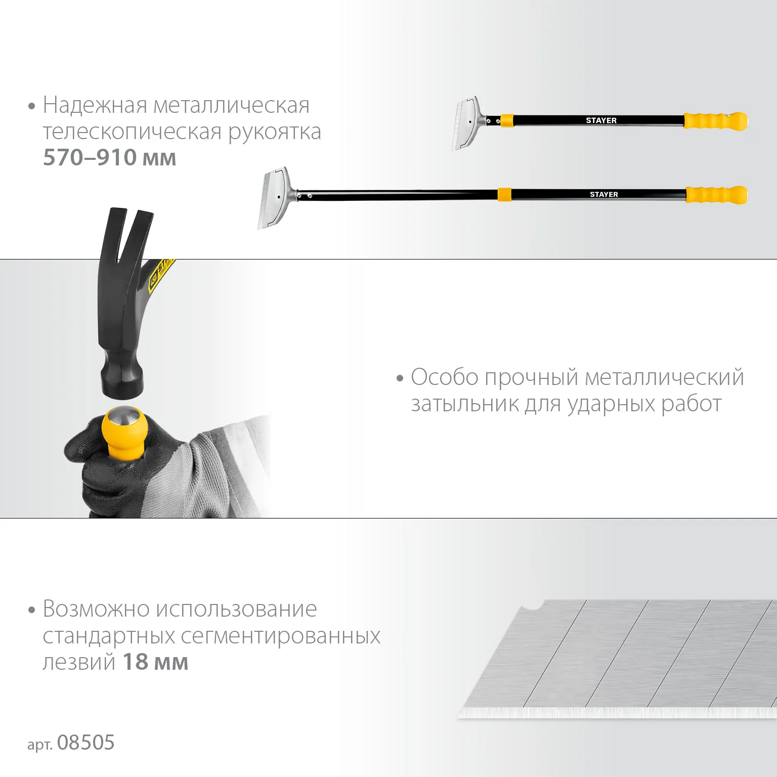 Ударный телескопический скребок предназначен для зачистки поверхностей от различных загрязнений. Телескопическая рукоятка позволяет увеличивать длину скребка