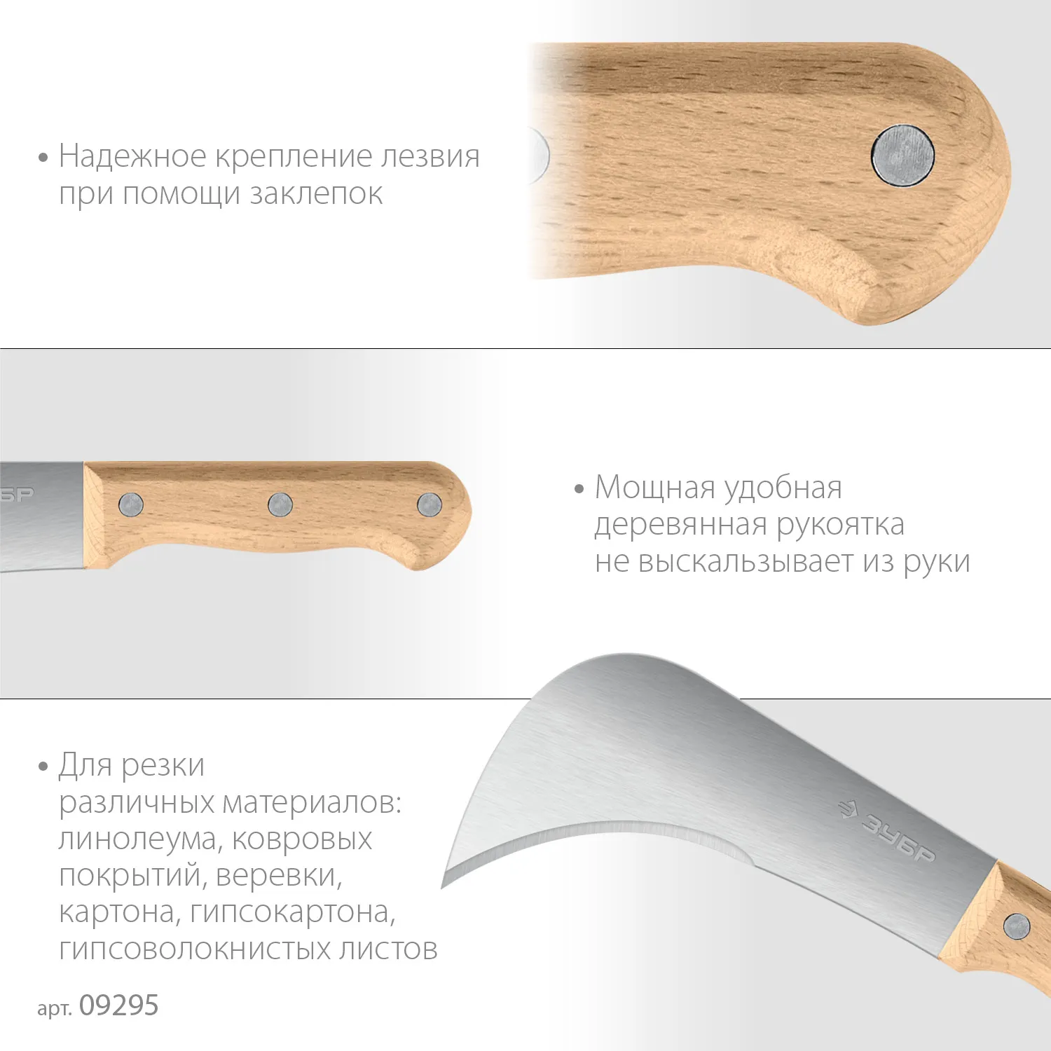 Специальный нож с изогнутой формой лезвия отлично подходит для реза листовых и рулонных материалов: линолеум, ковролин, веревка, канат, ГВЛ, ГВЛВ