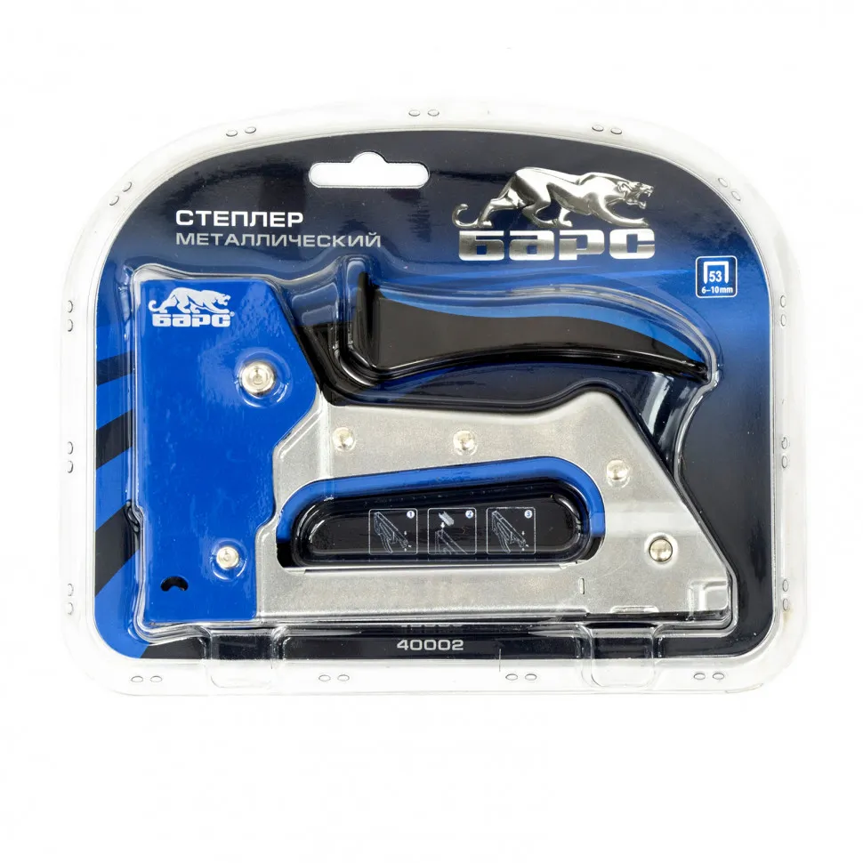 Металлический степлер Барс 40002 с двухкомпонентной рукояткой, для скоб типа 53 размером 6-10 мм, используется для сборки и обивки мебели, фиксации изоляционных материалов, а также других монтажных и отделочных работ. Позволяет быстро соединять с деревянным основанием листовые материалы из ДВП, ДСП, картона, оргалита, фанеры, пленки ПВХ. Благодаря рессорному ударному механизму инструмент не требует от оператора значительных усилий, поэтому подходит для длительной работы.ПреимуществаПрочность — стальной корпус, изготовленный методом штамповки, устойчив к деформации.Быстрая загрузка скоб — благодаря выдвижной обойме “зарядка” инструмента занимает несколько секунд.Комфорт во время работы — эргономичная обрезиненная рукоятка не скользит в руке.Контроль наличия скоб — в боковой части корпуса предусмотрено специальное окошко.Безопасное хранение и транспортировка — ручка фиксируется в горизонтальном положении, что исключает случайное срабатывание степлера.