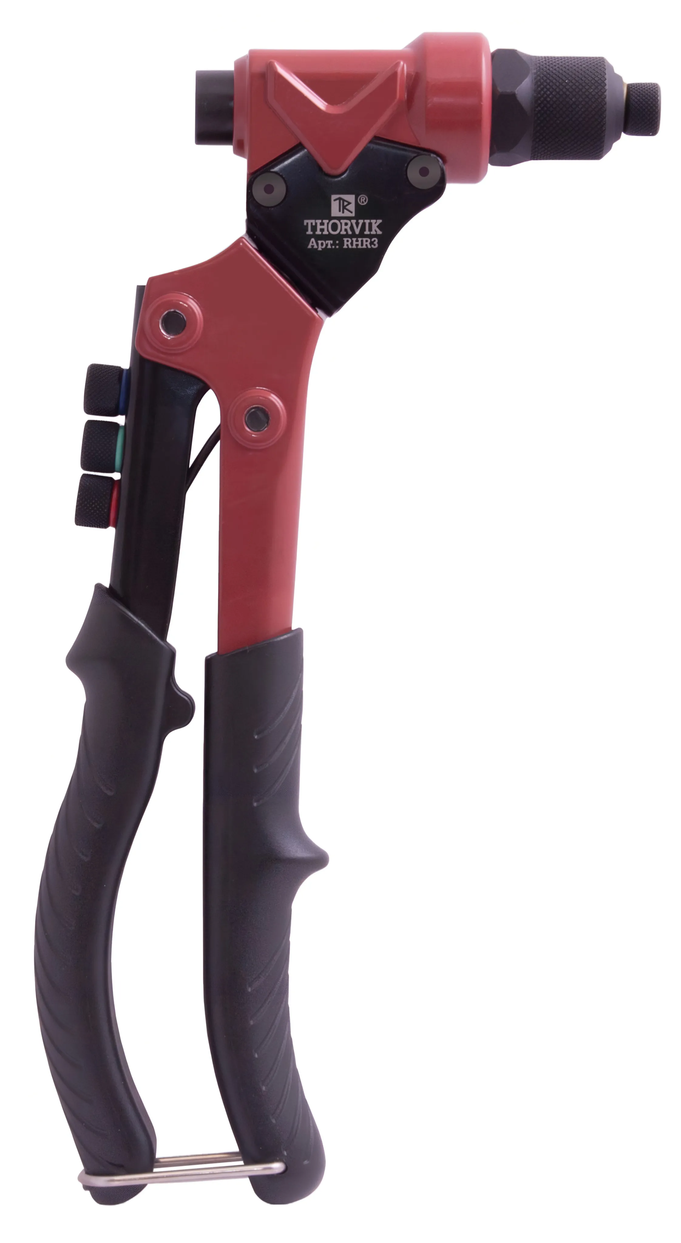 Ручной рычажный универсальный заклепочник THORVIK предназначен для работы с резьбовыми и вытяжными заклепками с алюминиевыми и стальными сердечниками. В комплект поставки входят две просечки круглого и прямоугольного сечения для работы с листовым металлом. Заклепочник имеет алюминиевый корпус и рычаги, изготовленные из закаленной углеродистой стали. Вращение головки облегчает применение инструмента в труднодоступных местах.