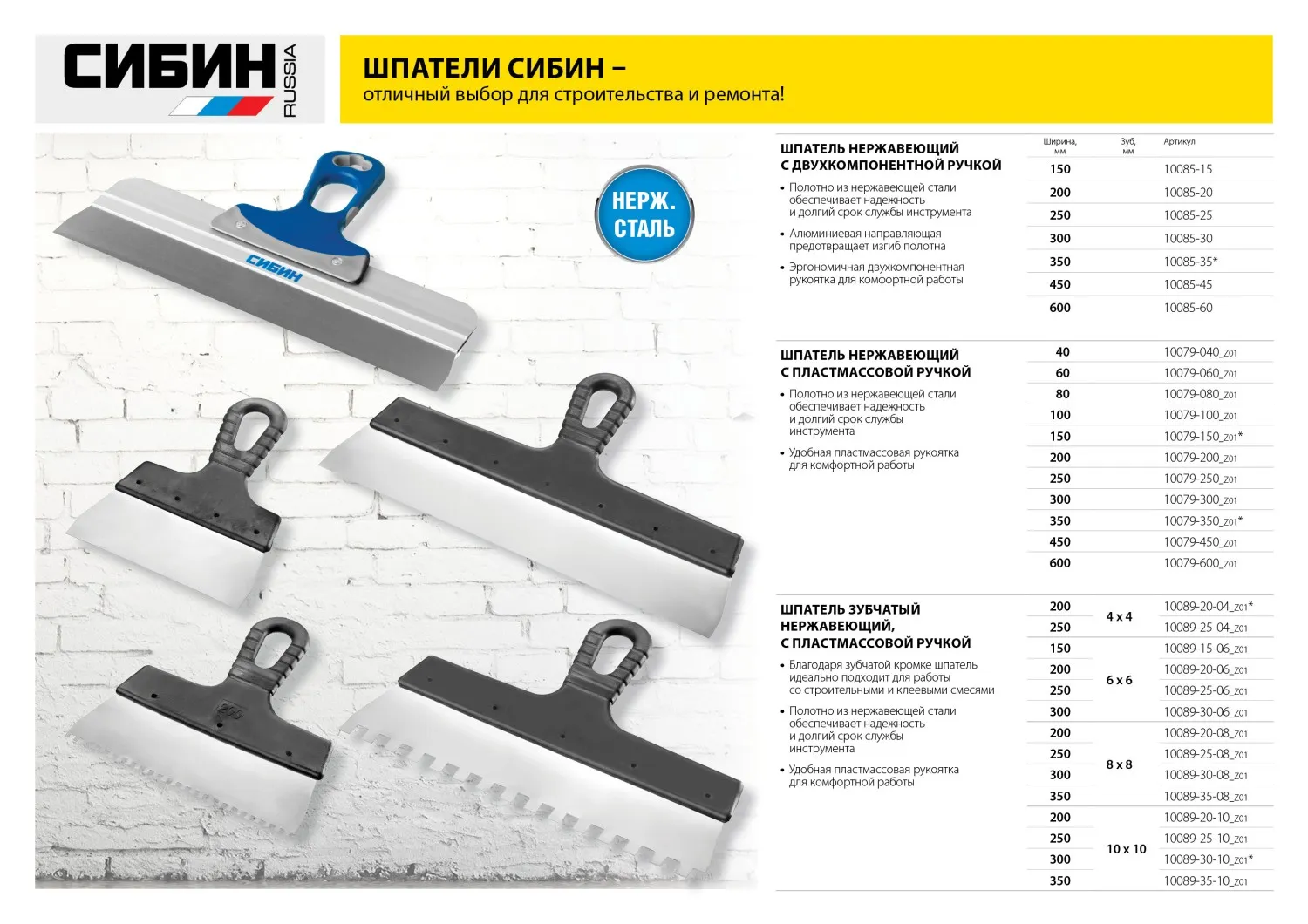 Шпатель СИБИН - отличный выбор для строительства и ремонта! Полотно из нержавеющей стали обеспечивает надежность и долгий срок службы инструмента, а удобная пластмассовая рукоятка создает условия для комфортной работы
