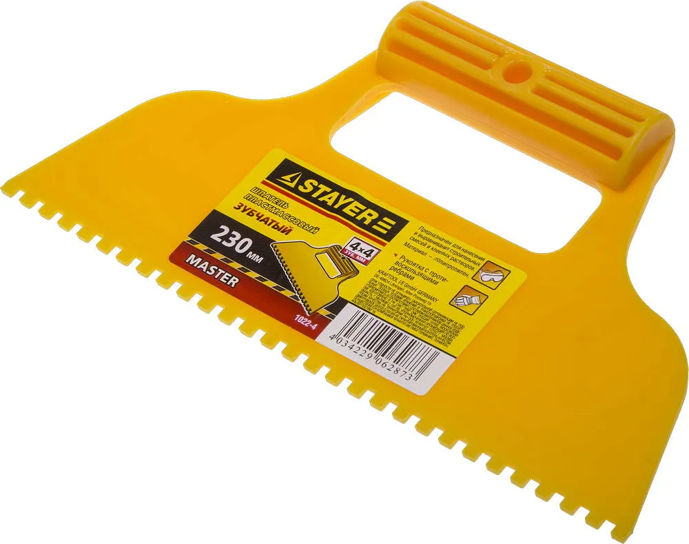 Благодаря зубчатой кромке шпатель идеально подходит для работы со строительными и клеевыми смесями, удобная пластмассовая рукоятка с противоскользящими ребрами создает условия для комфортной работы