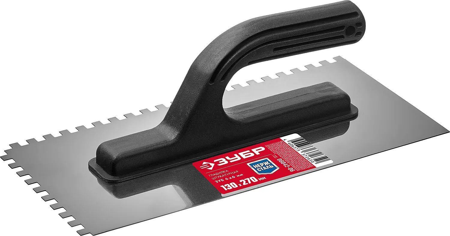 Зеркально отполированное нержавеющее полотно обеспечит надежность конструкции, лучшую защиту от коррозии, а удобная рукоять из пластмассы обеспечит комфортную работу при нанесении и распределении штукатурных смесей и клеевых составов.