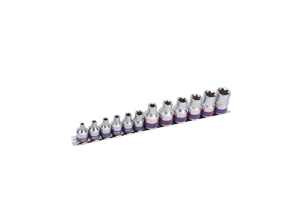 Набор профессионального качества состоит из 12 коротких торцевых головок Е-типа с рабочими размерами от E4 до E20, размещённых на металлическом держателе длиной 260 мм. Предназначен для использования в ремонтных работах на станциях технического обслуживания автомобилей и других предприятиях, а также в частных гаражах.