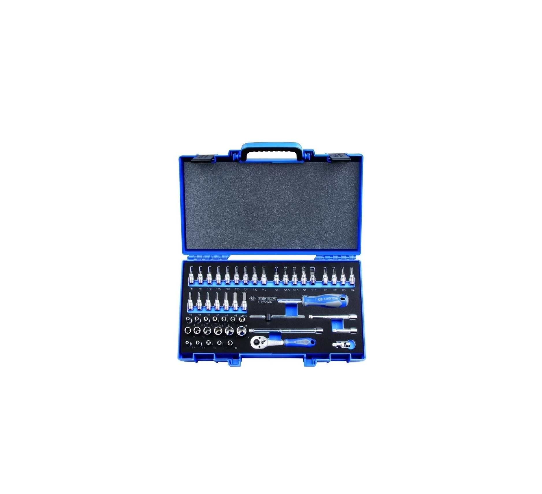 Набор с инструментом торговой марки King Tony включает в себя торцевые головки, насадки формата 1/4" и принадлежности к ним. Идеально подходит для работы с механизмами небольших габаритов, к примеру, двигателями мотоциклов или скутеров, велосипедов.