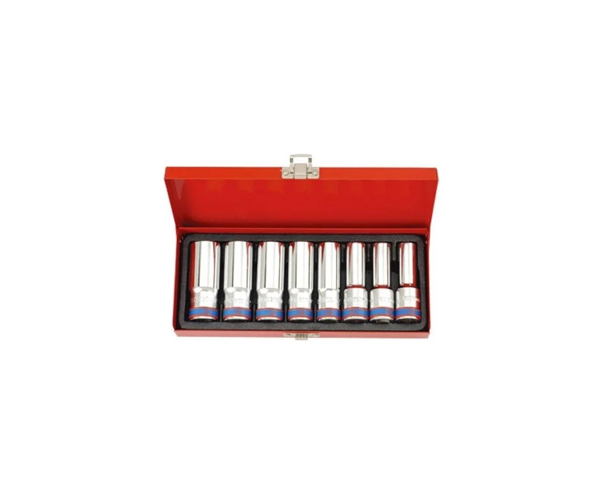 Набор инструментов King Tony 4208MR01 с присоединительным квадратом 1/2 дюйма включает в себя 8 двенадцатигранных глубоких торцевых головок с рабочими размерами от 12 до 24 мм в металлическом кейсе.