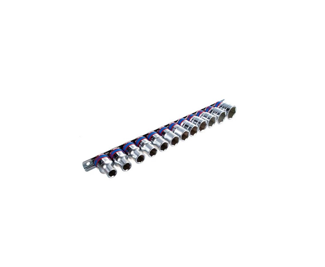Набор слесарного ручного инструмента профессионального качества King Tony 4312MR8 с присоединительным квадратом 1/2 дюйма составлен из 12-ти шестигранных коротких торцевых головок с рабочими размерами от 10 до 24 миллиметров. Головки размещаются на металлическом держателе.